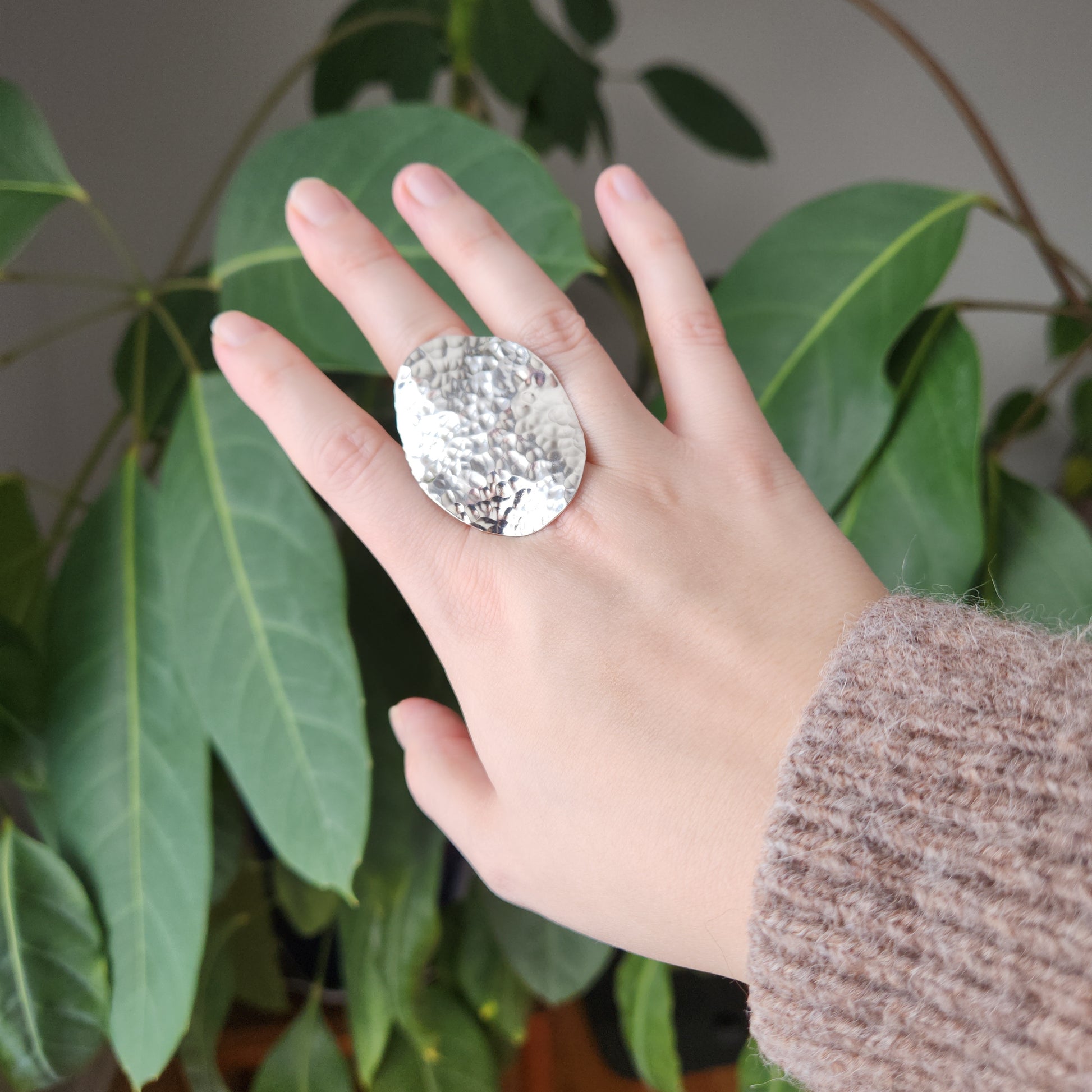 A true statement piece, over 4 cm at it's longest dimension and 3cm wide, it anoints the finger like a silvery lily pad.