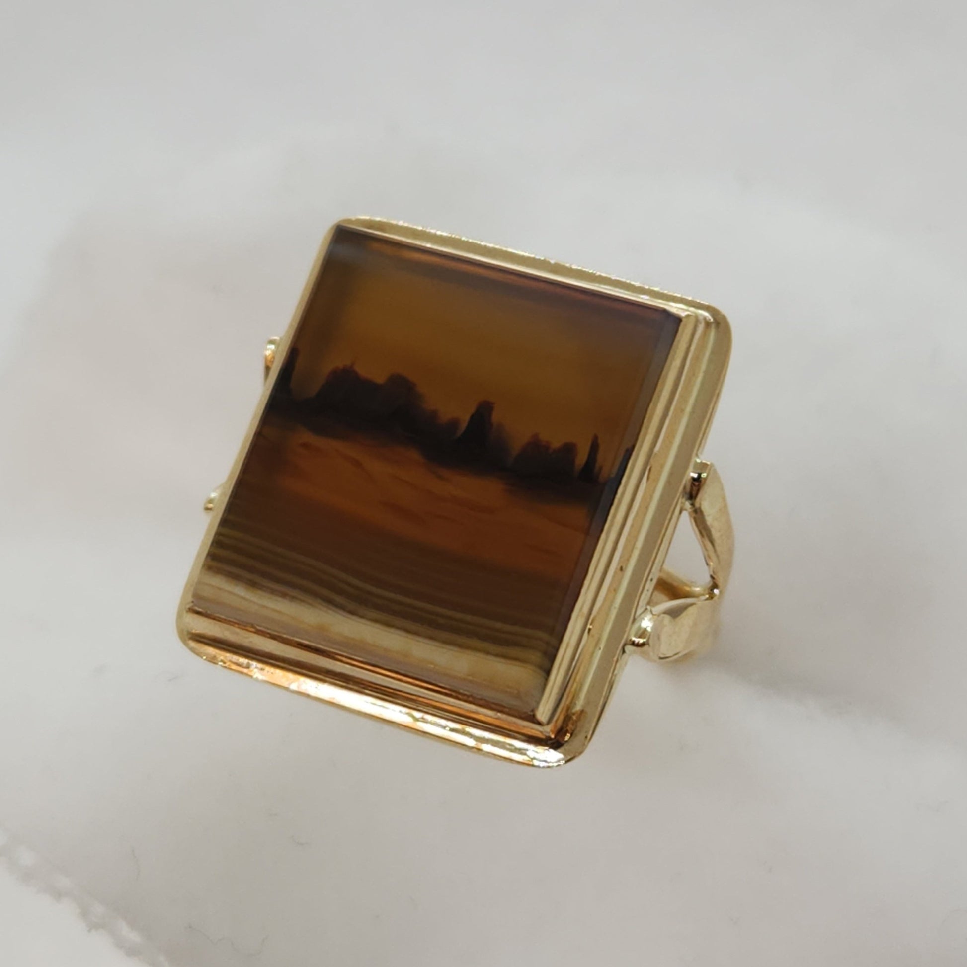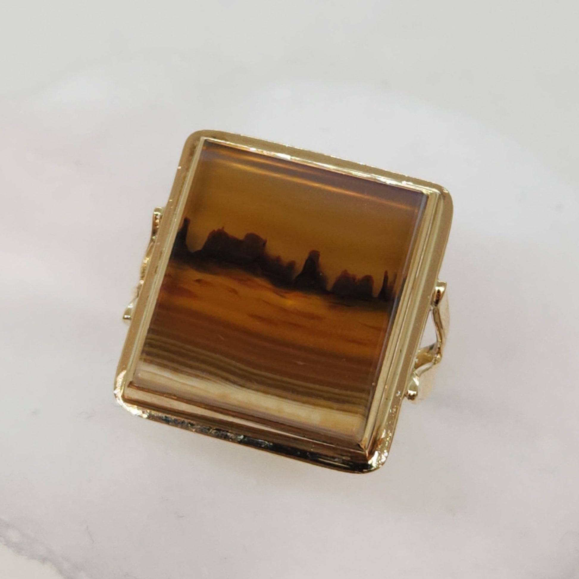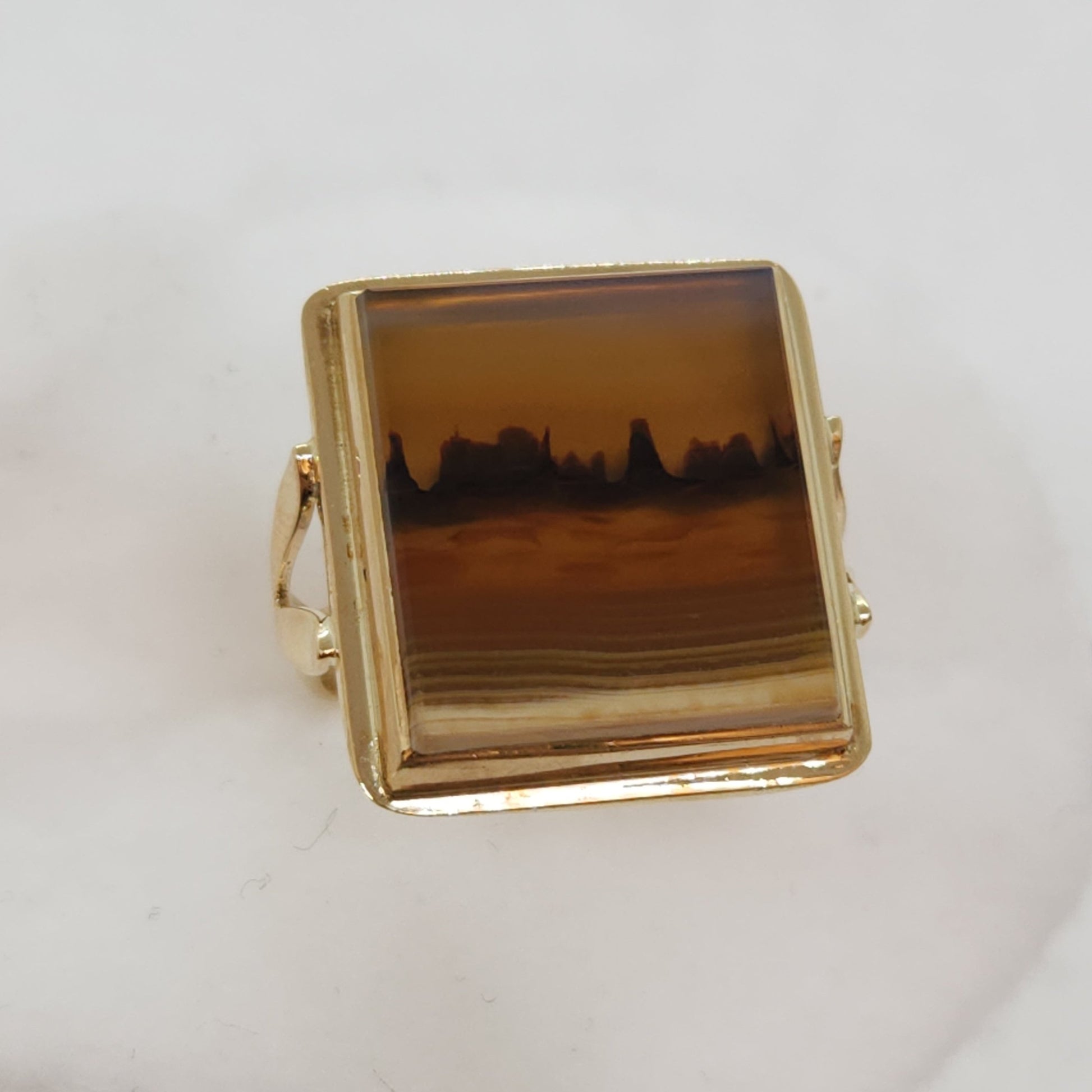 While agate is plentiful, this is a spectacular specimen. Reminding us of a sunset on a city skyline, the detail is intricate. Even from the side profile, this ring is a work of art! This is a handmade piece.