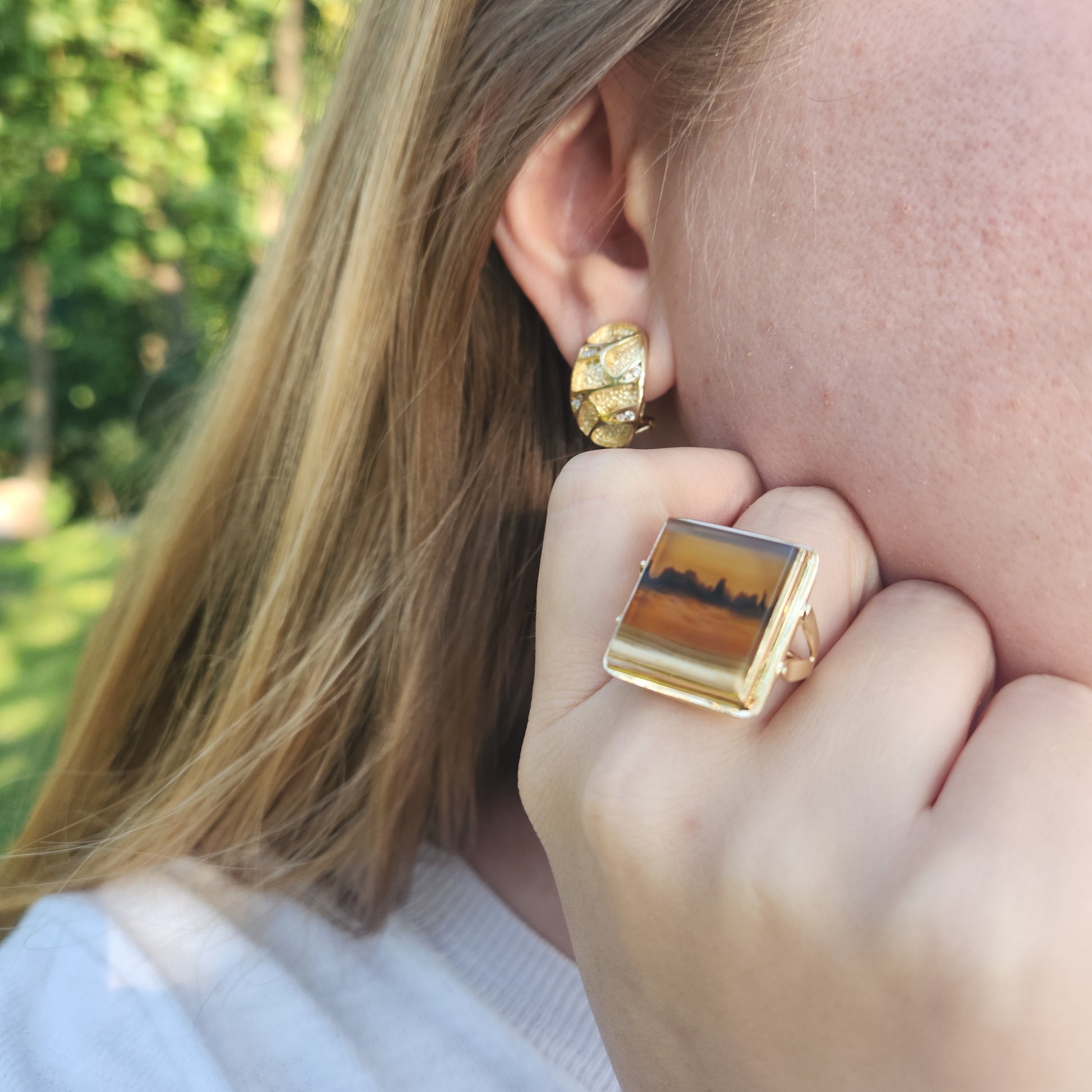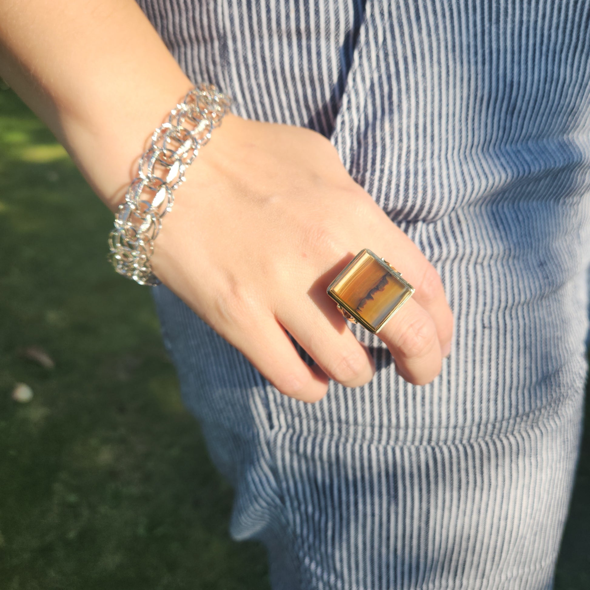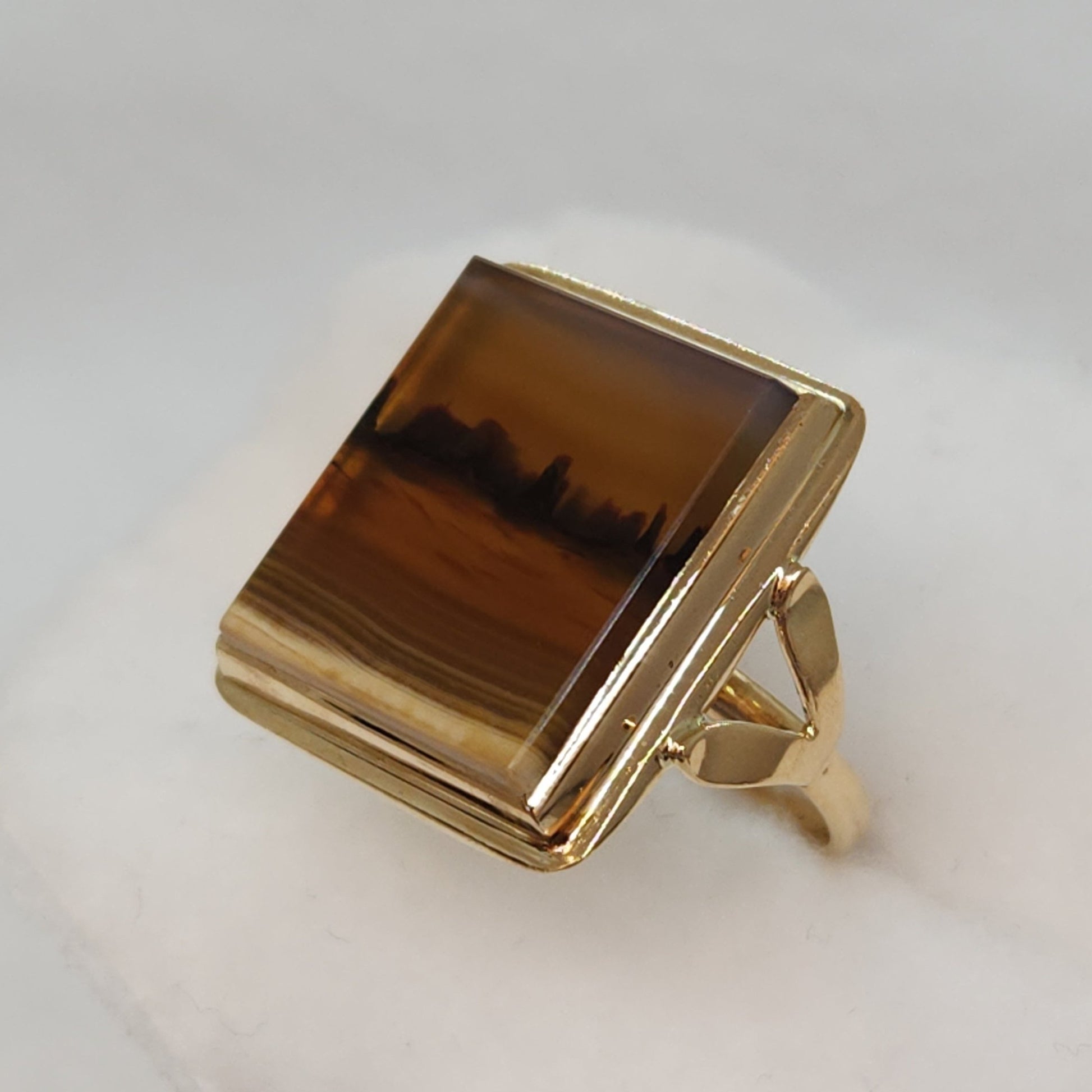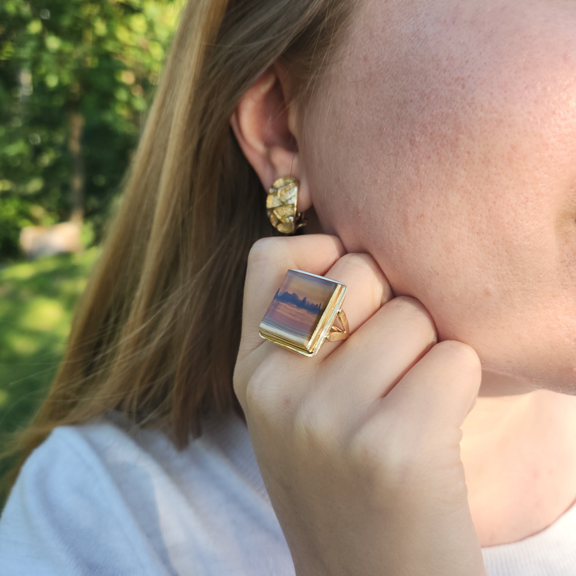 While agate is plentiful, this is a spectacular specimen. Reminding us of a sunset on a city skyline, the detail is intricate. Even from the side profile, this ring is a work of art! This is a handmade piece.