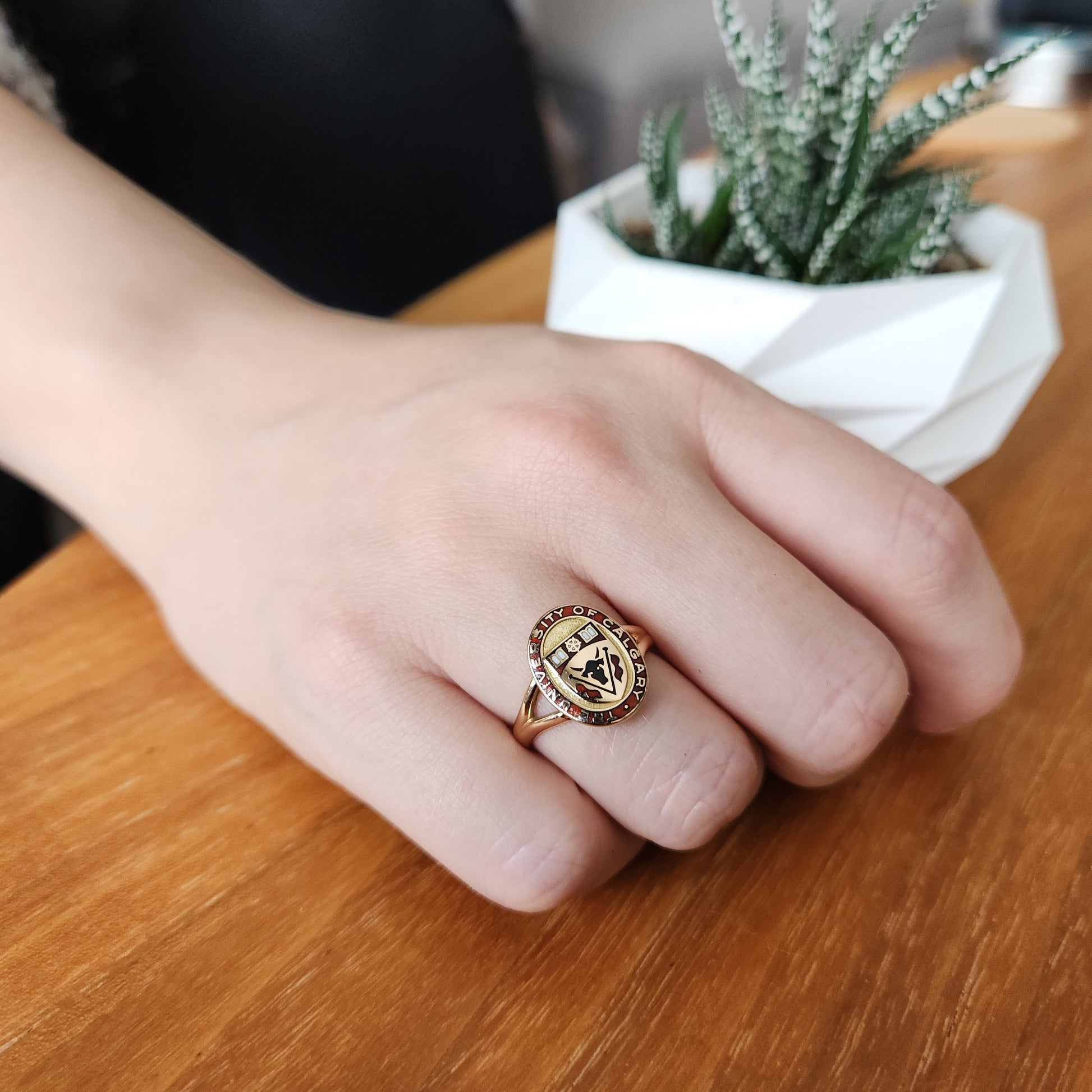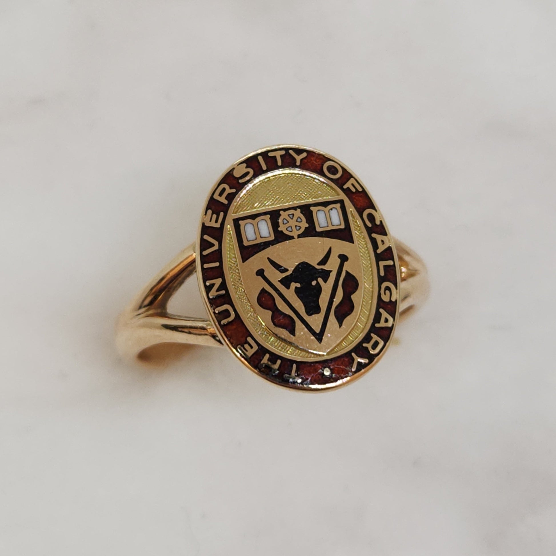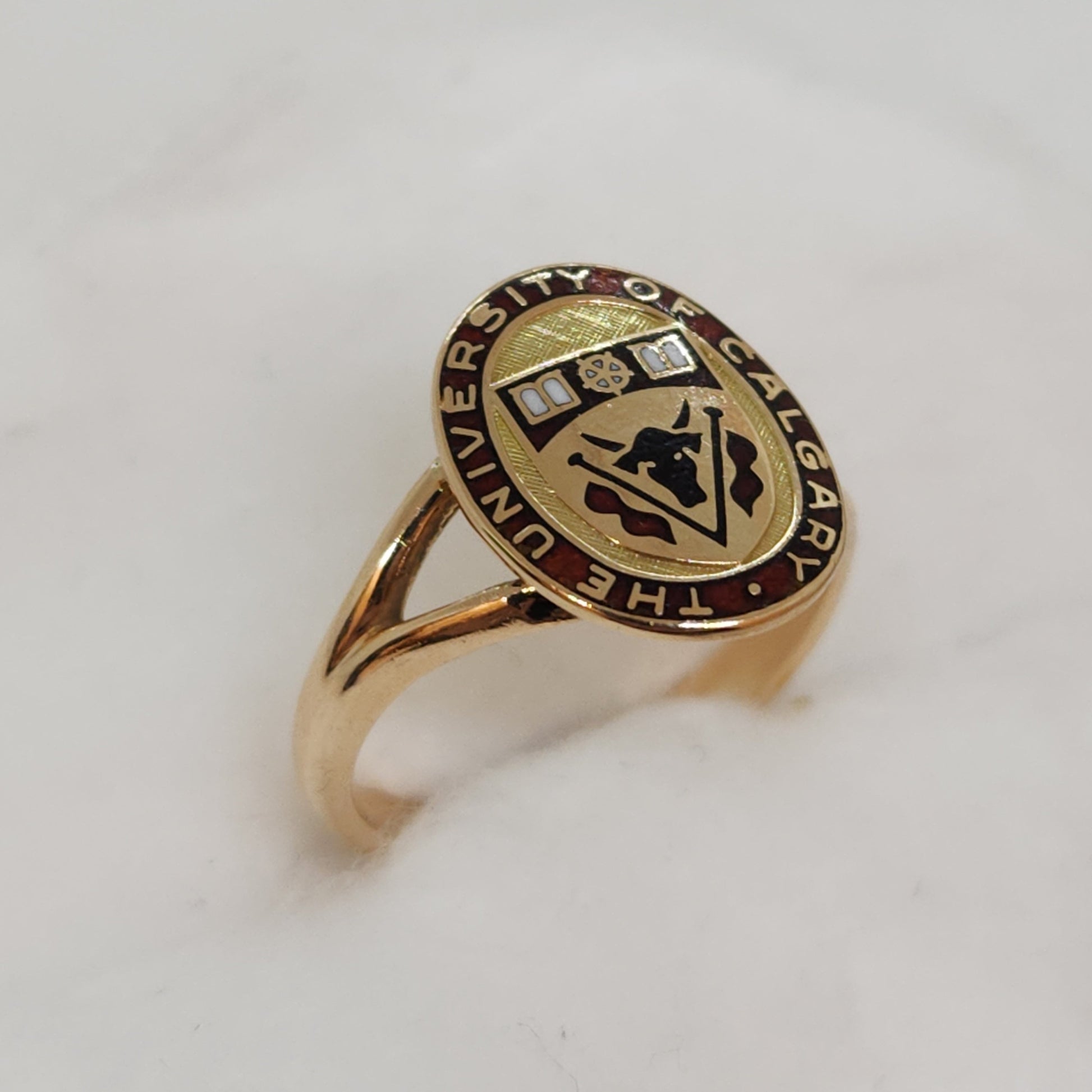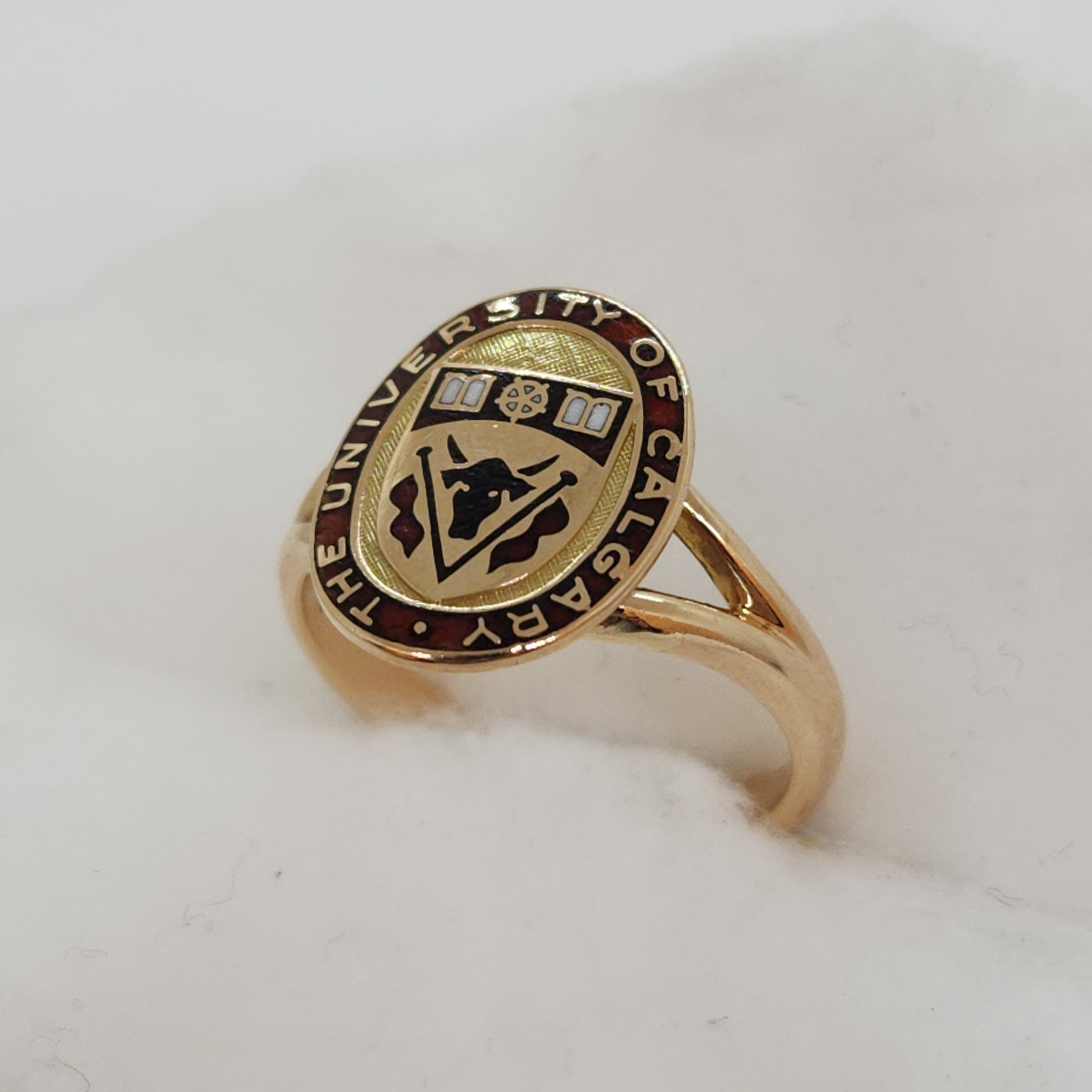Not your traditional graduation ring! This is lightweight with striking red, black and white enamel detail. Made by Birks, the attention to detail and precision is evident. Take this preloved ring home and wear it with pride.