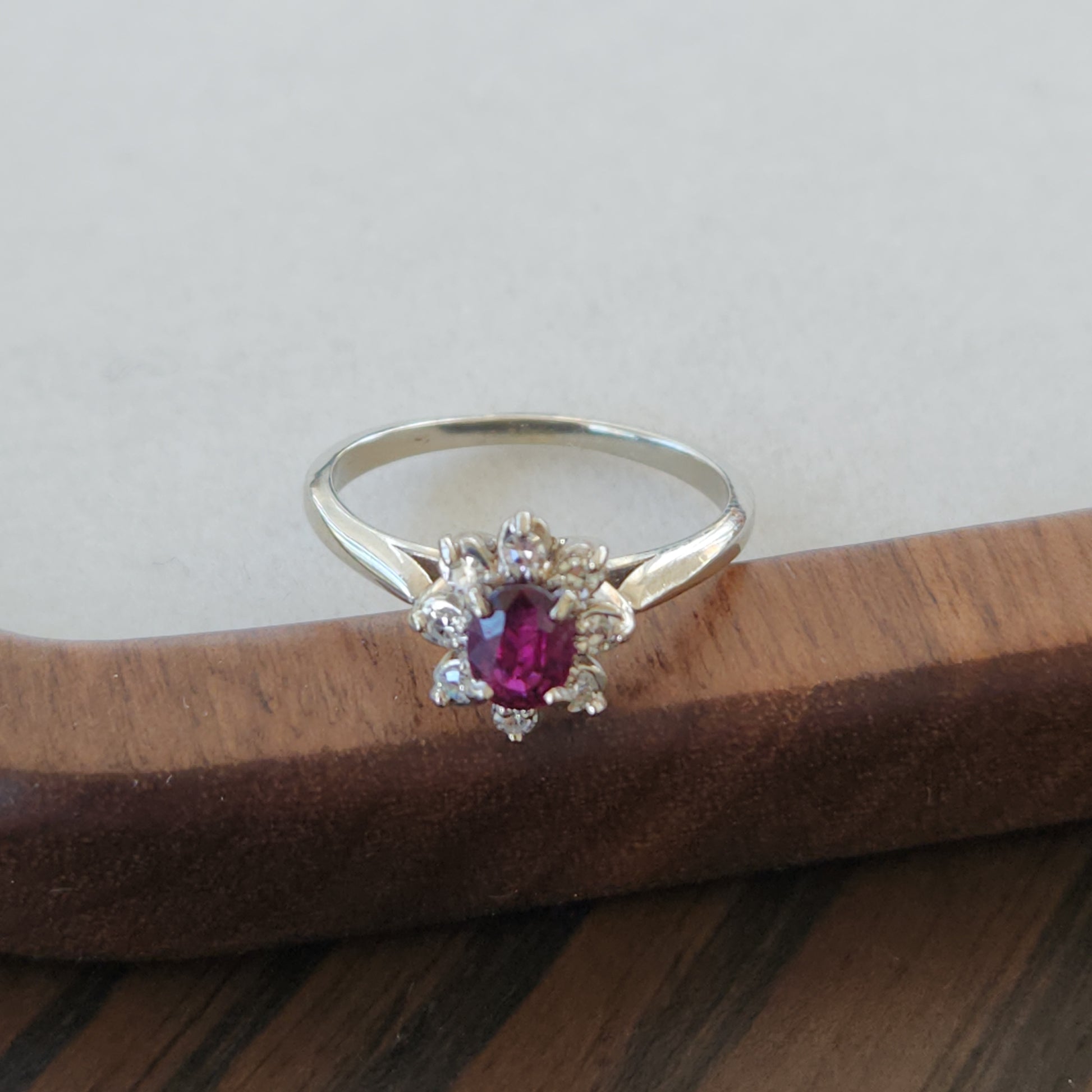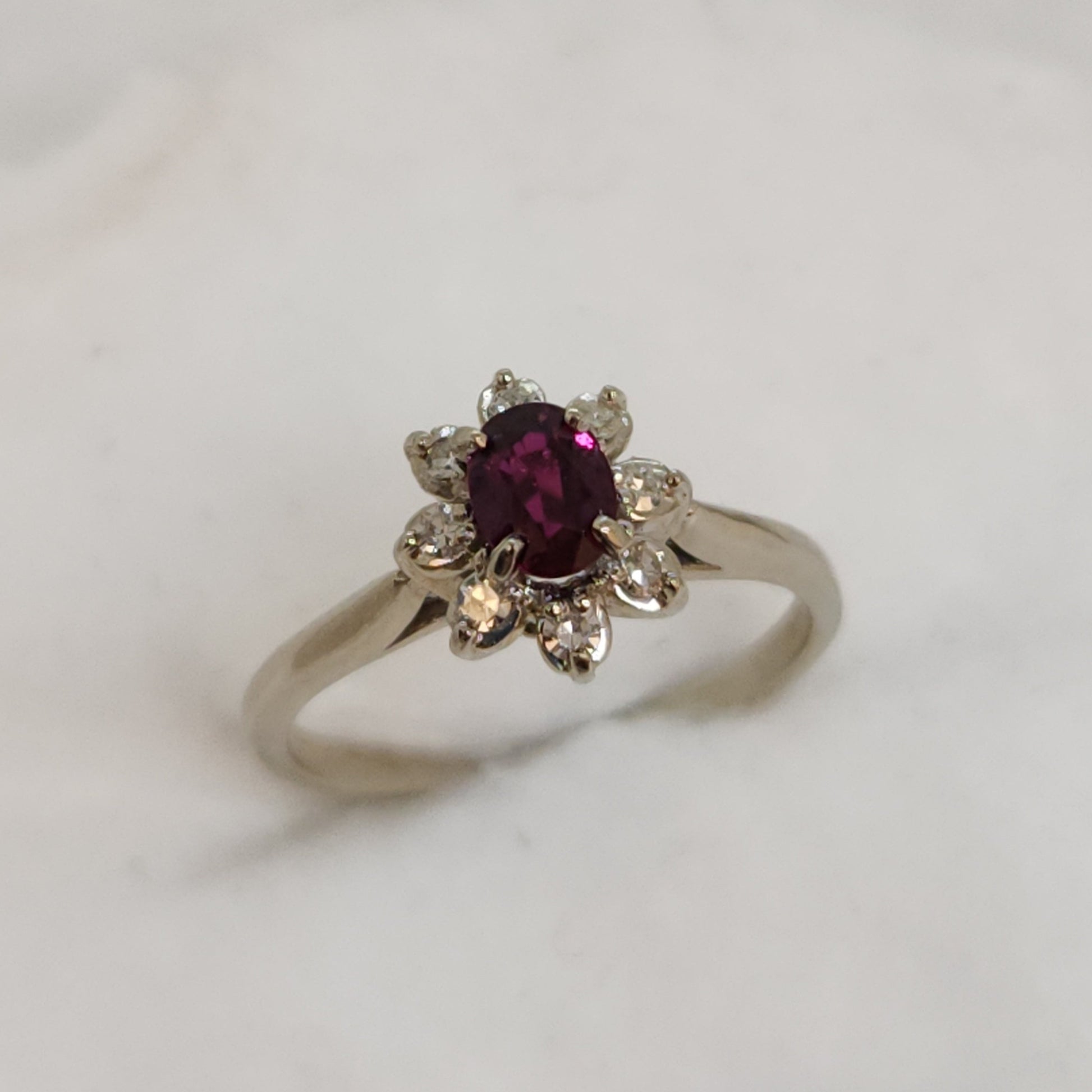 A ruby, the shade of the ripest raspberry of the season. The halo ring design has roots in the Georgian era (1714-1837) and gained popularity in the Victorian era (1837-1901), evolving into the classic halo style we know today during the Art Deco period of the 1920s. This timeless design in a classic wardrobe staple. Also perfect for those with a July birthday.