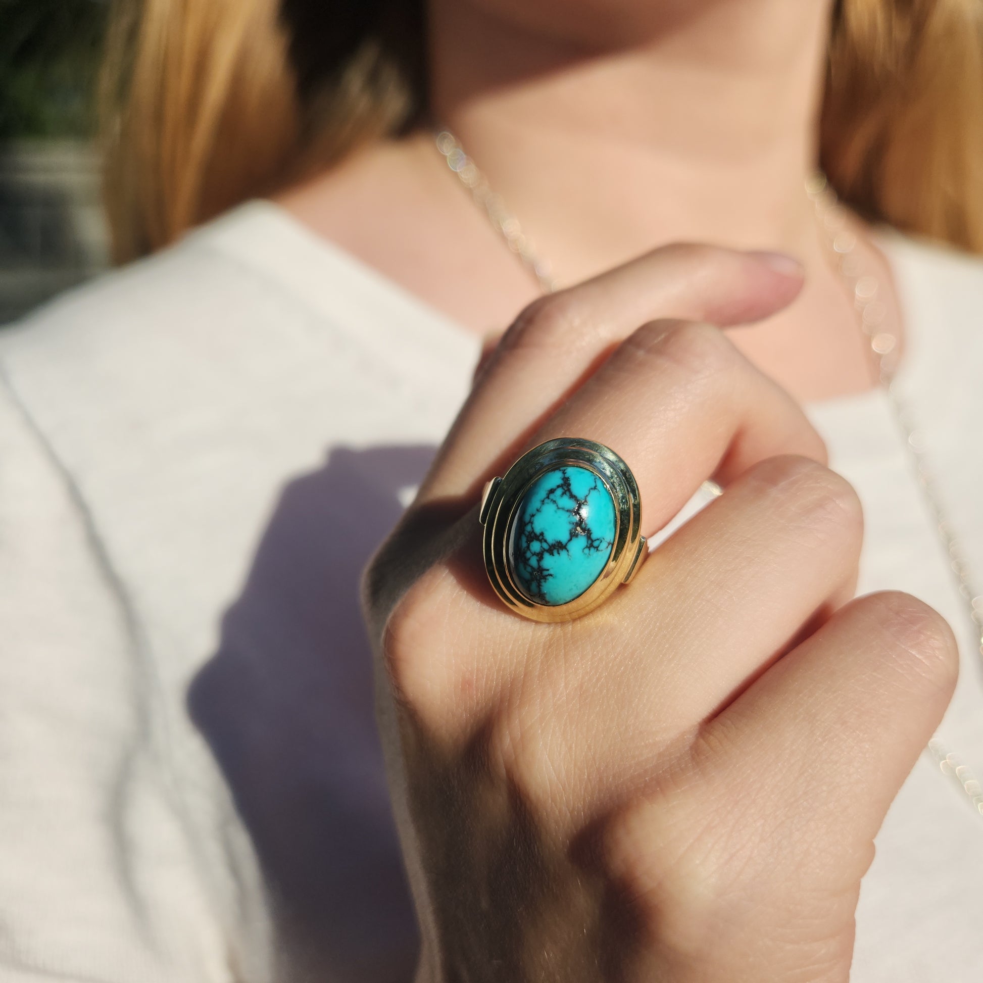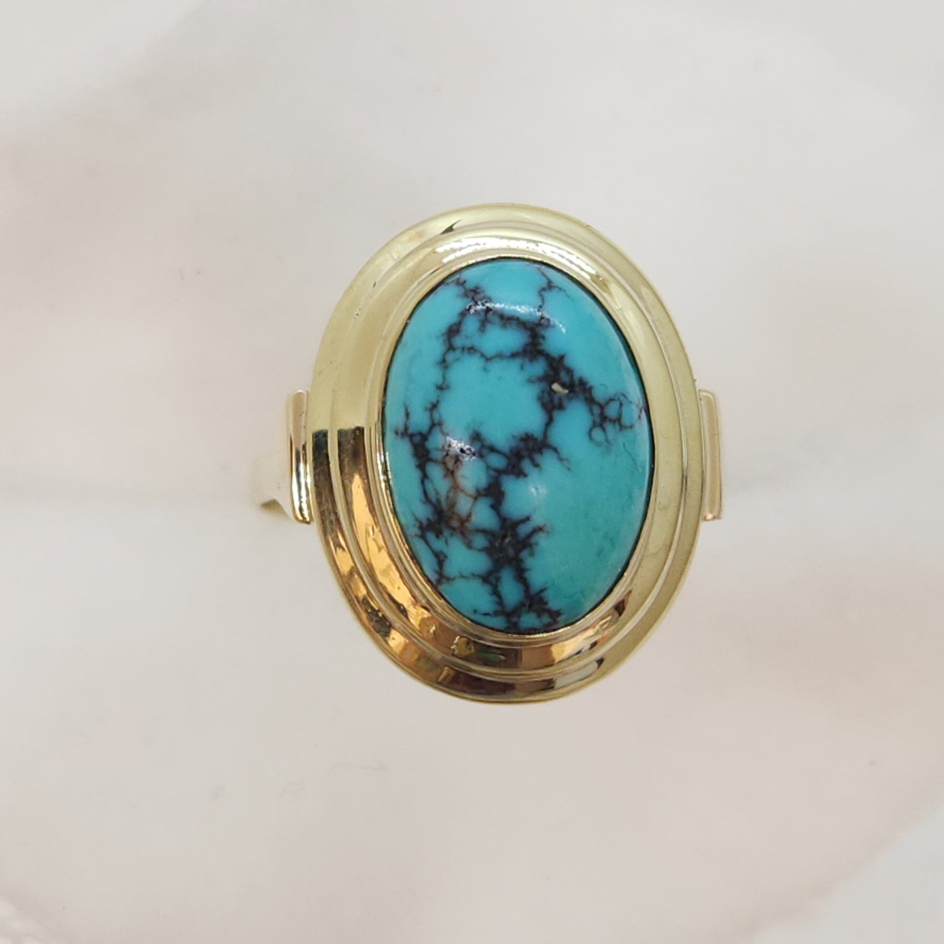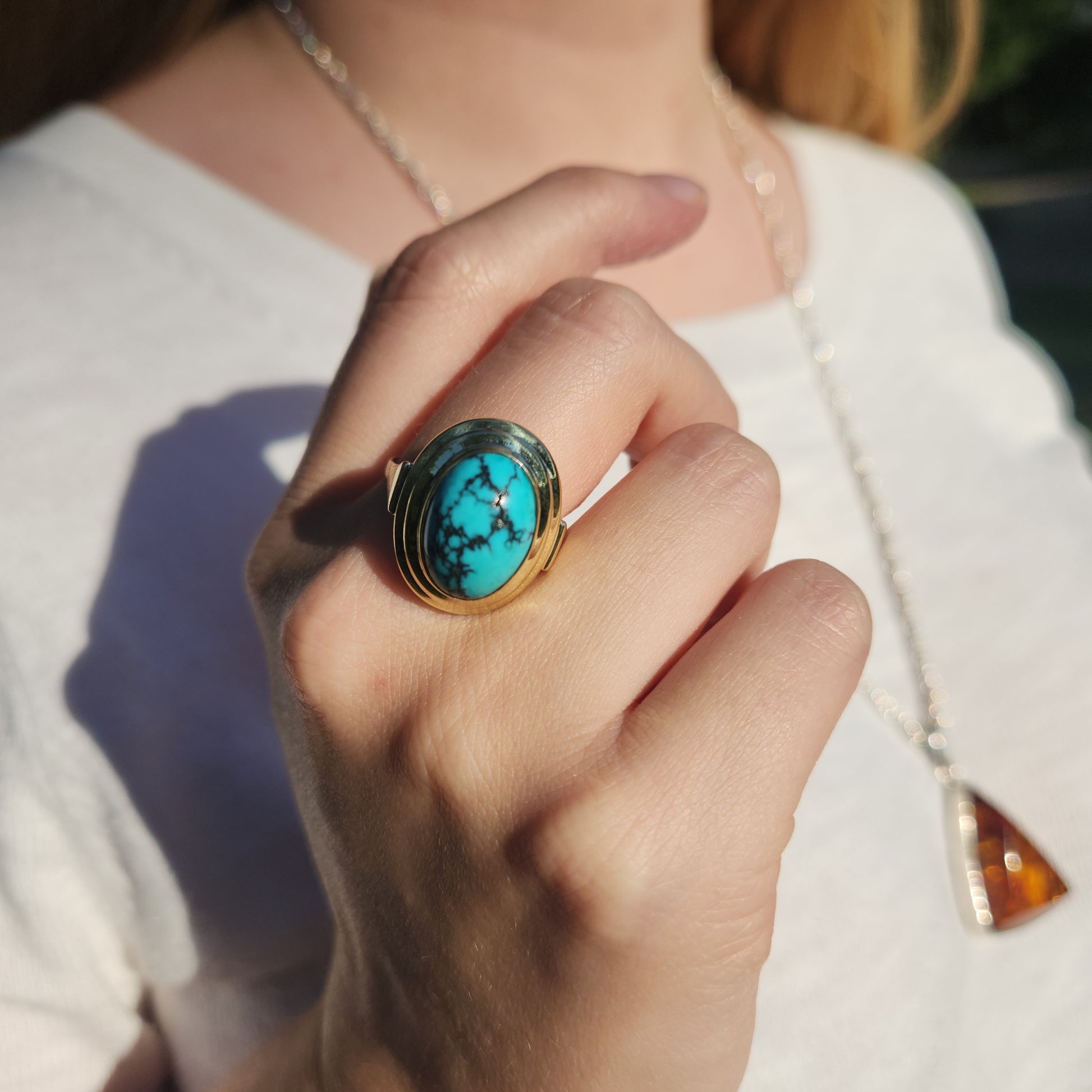 Turquoise with character! This specimen is a vibrant blue with black matrix, inclusions of it's host rock. The gold ring is curved on the inside for comfort and quite lightweight.