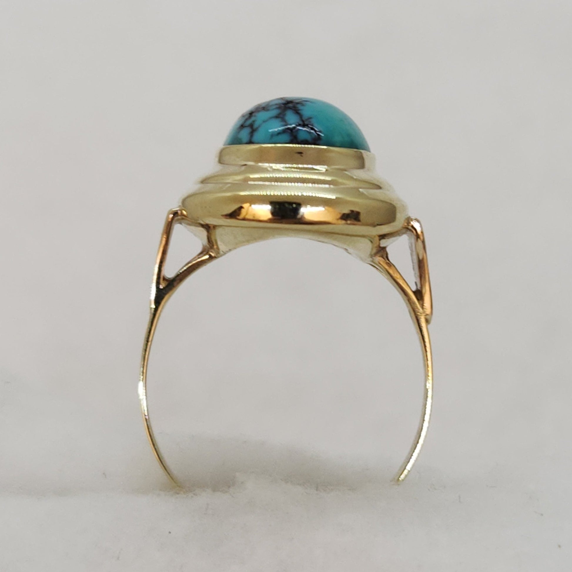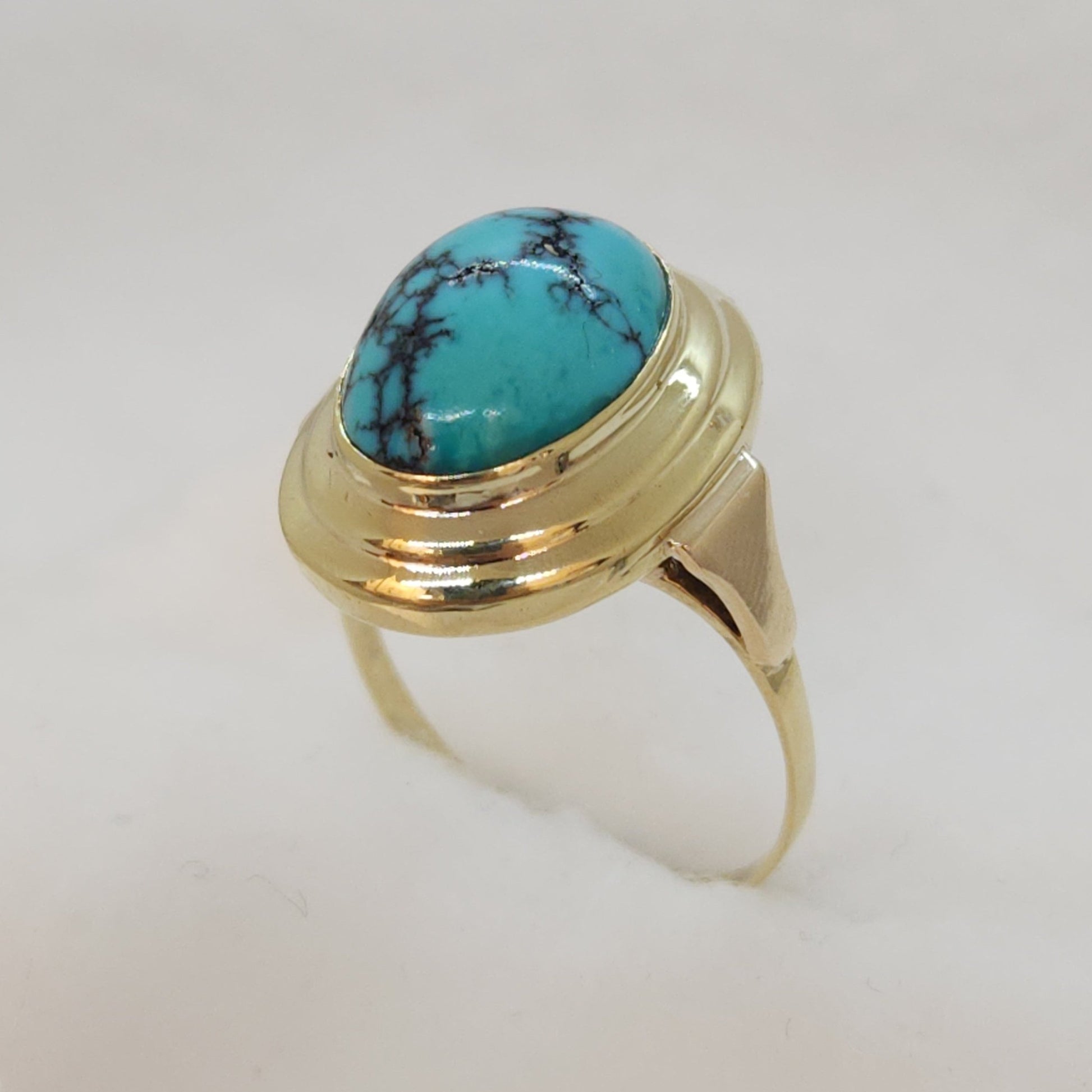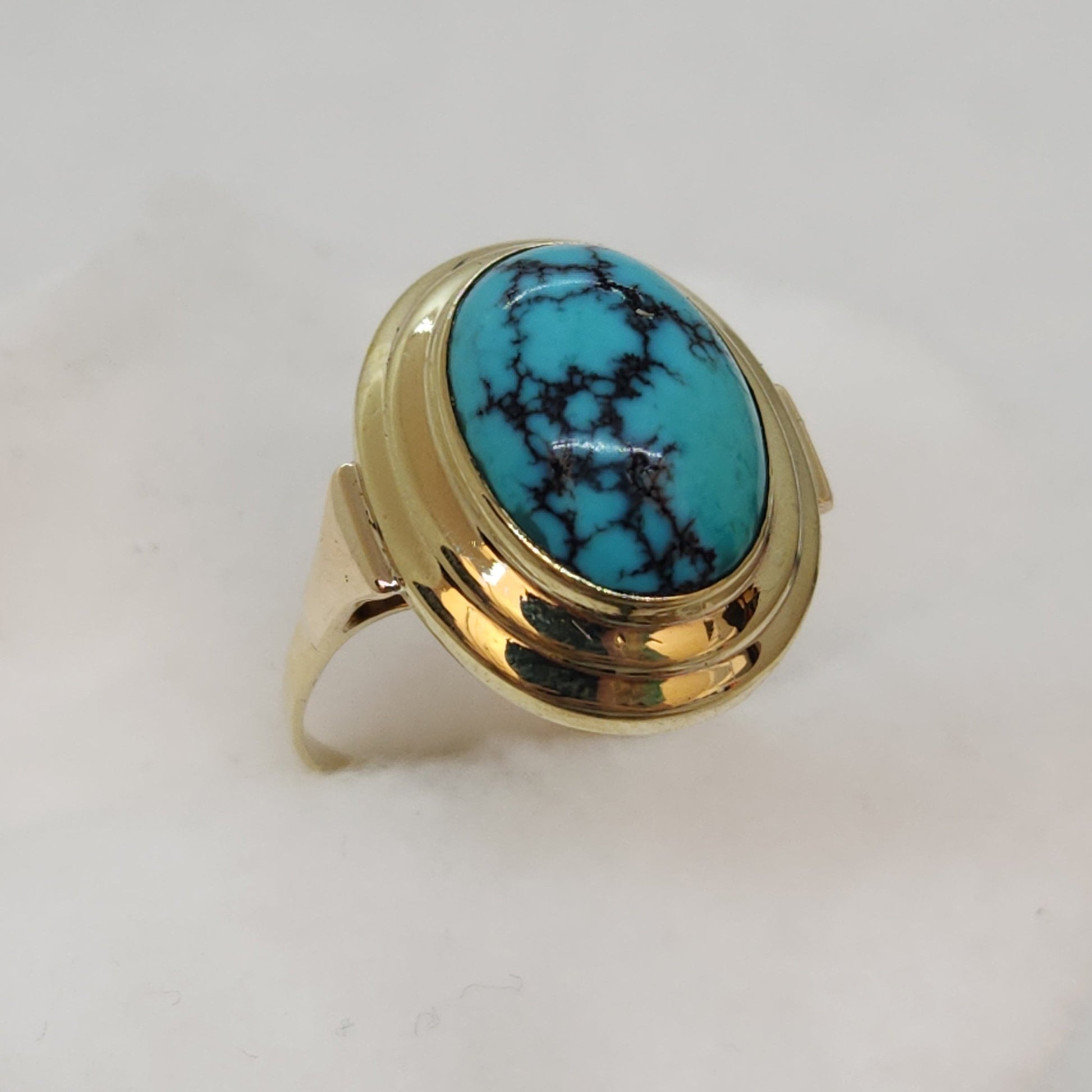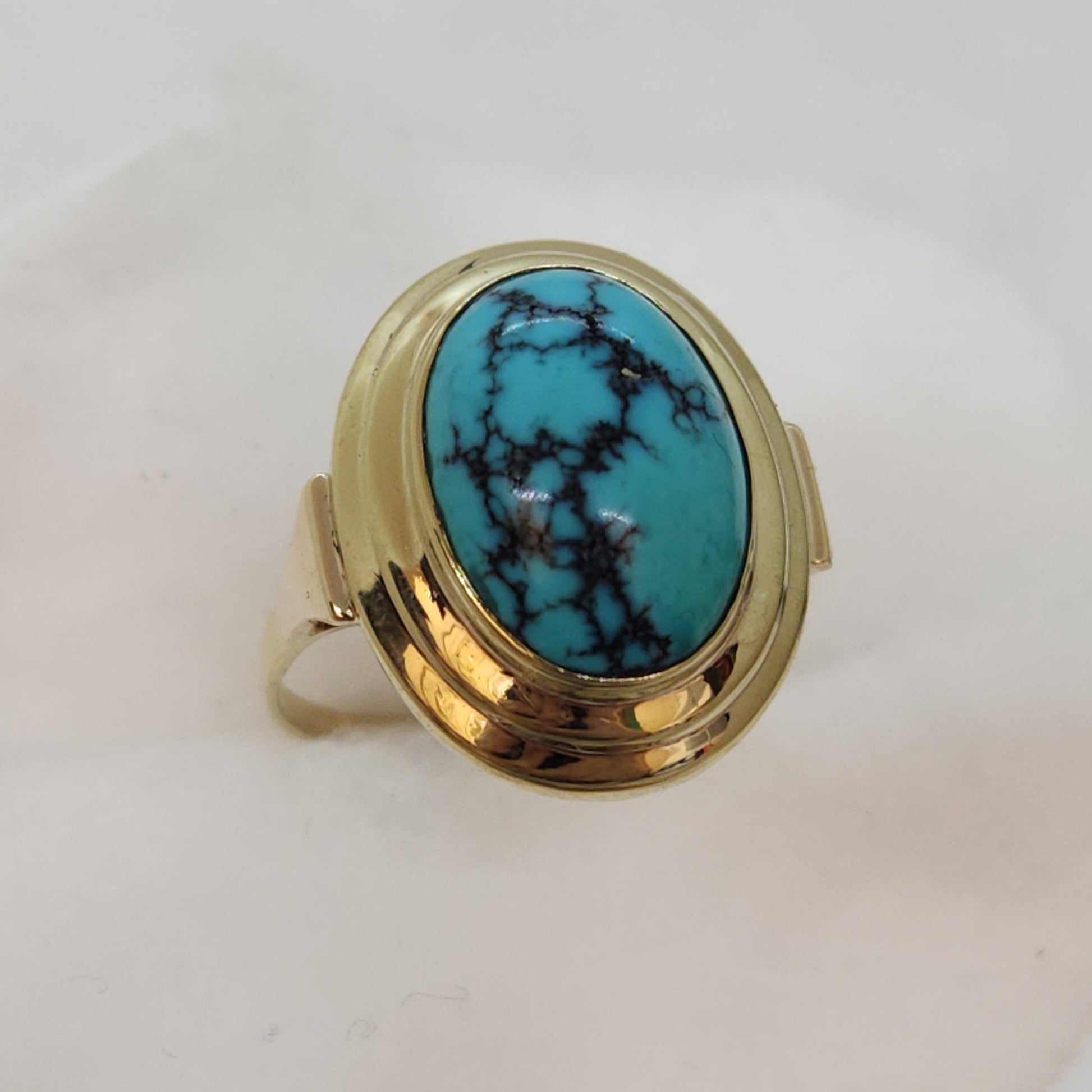 Turquoise with character! This specimen is a vibrant blue with black matrix, inclusions of it's host rock. The gold ring is curved on the inside for comfort and quite lightweight.