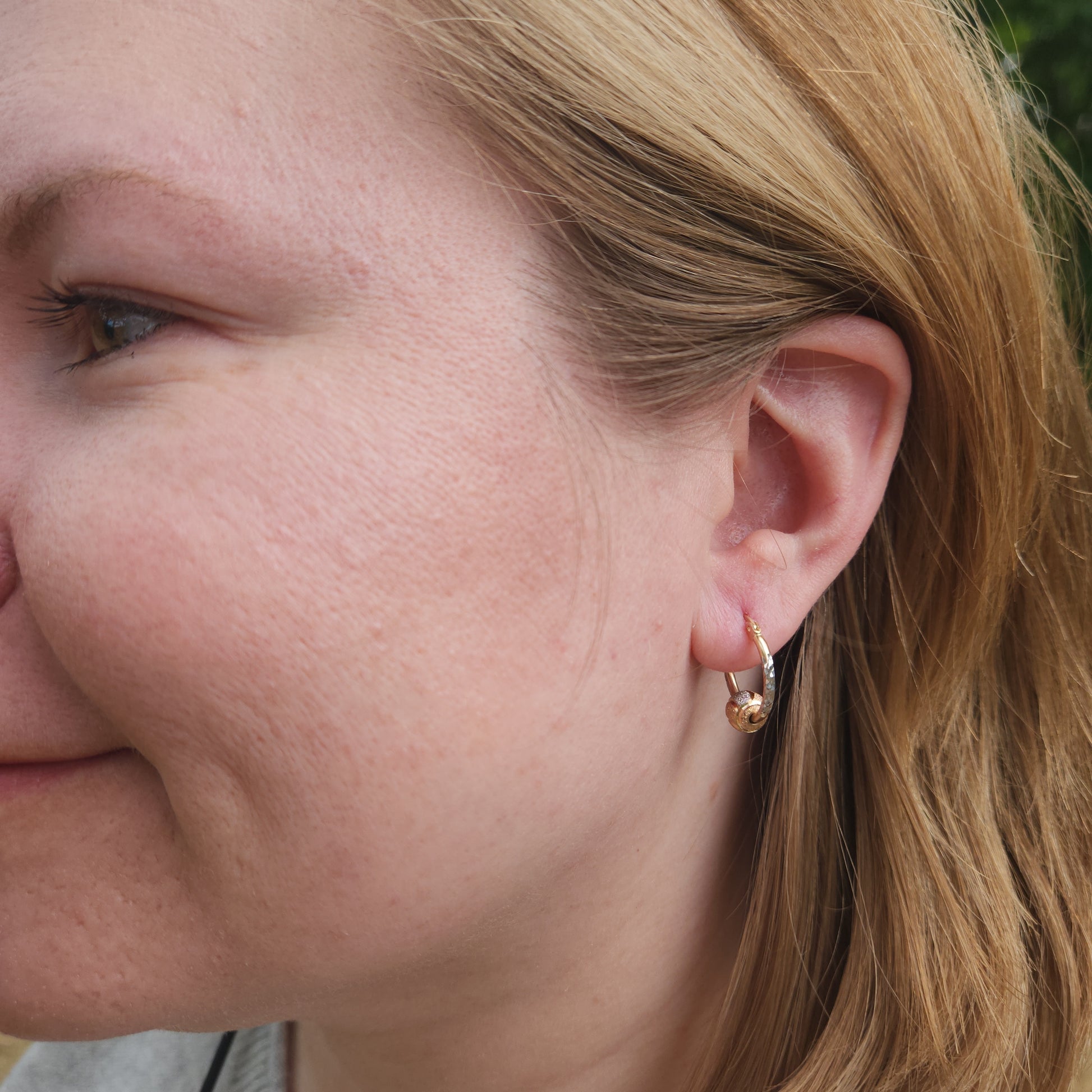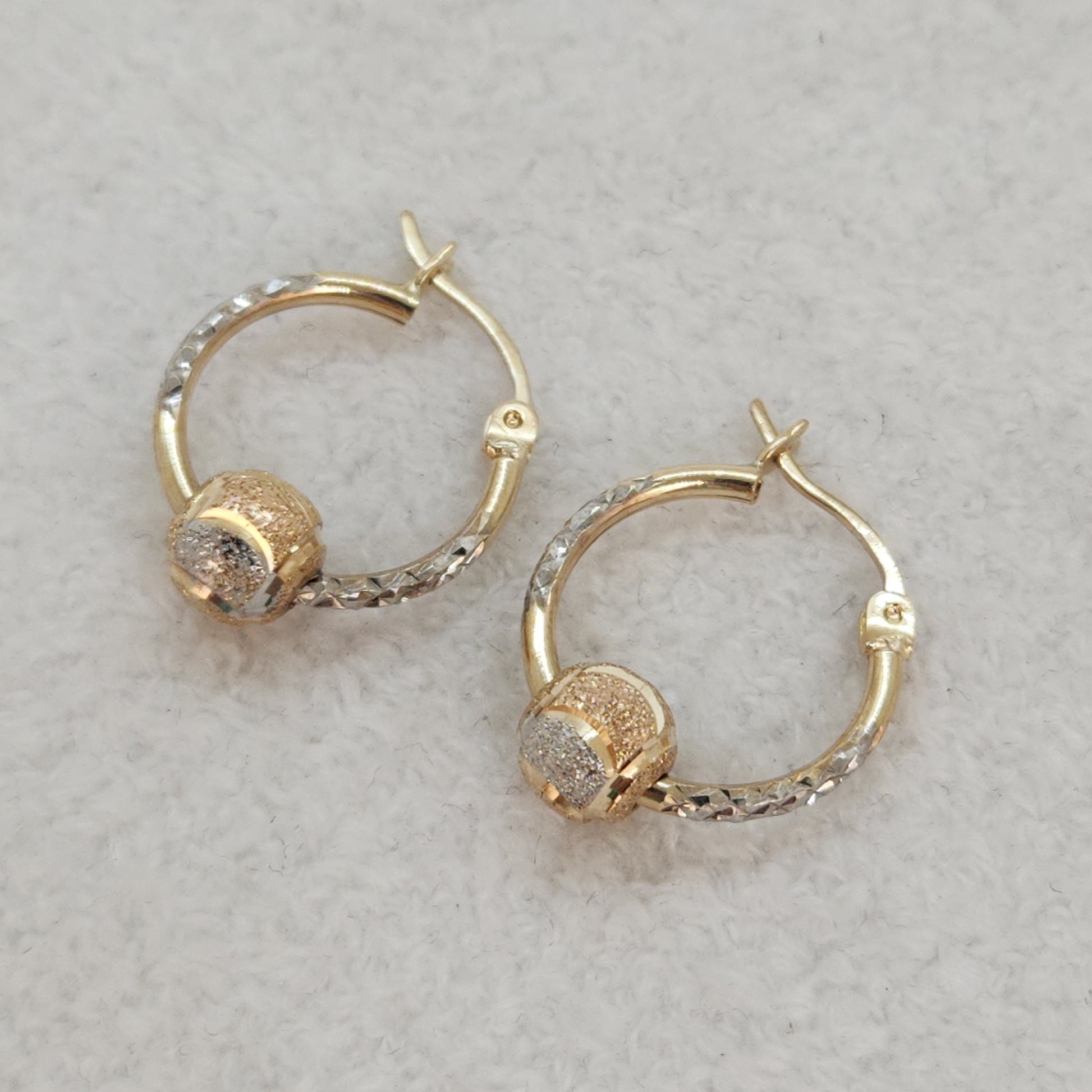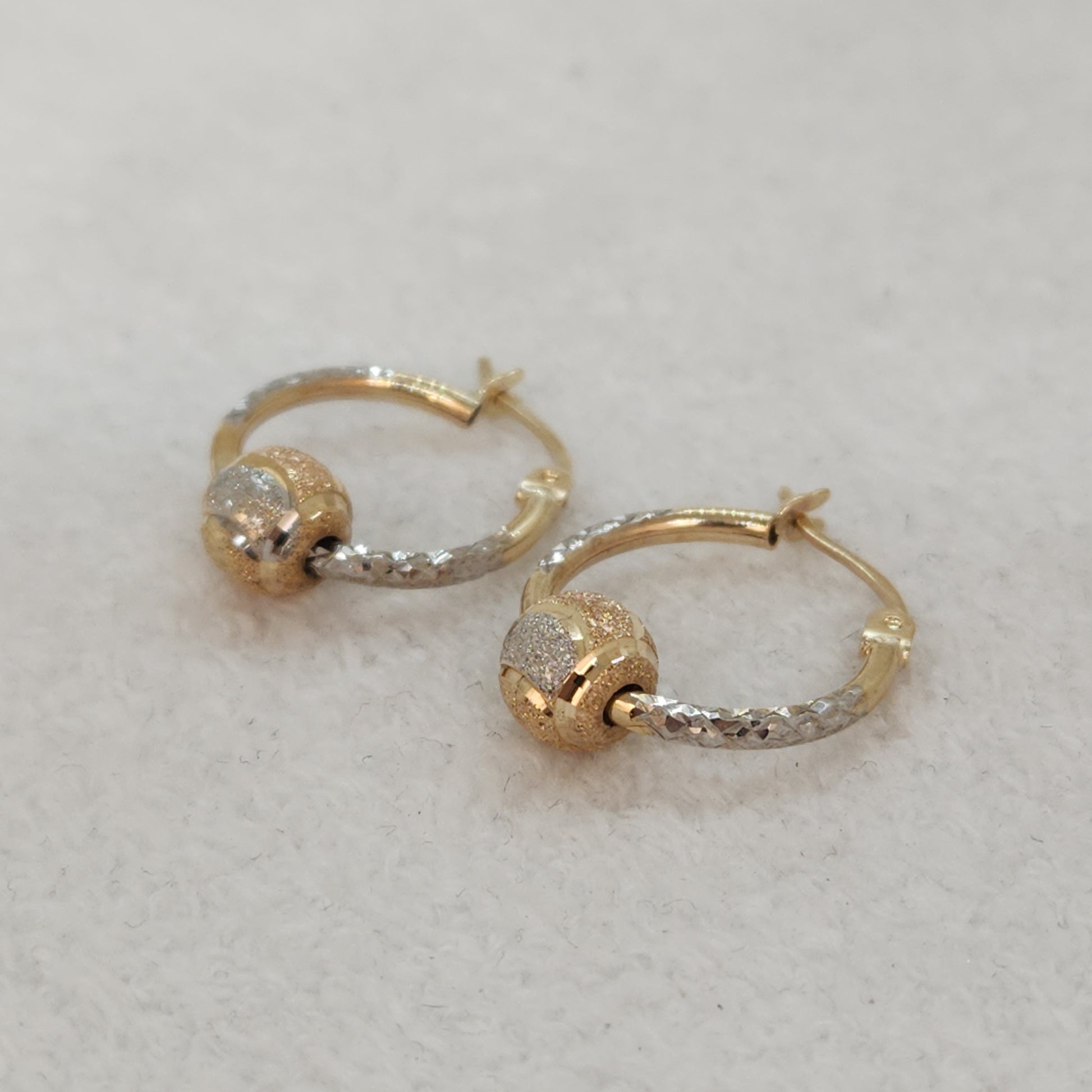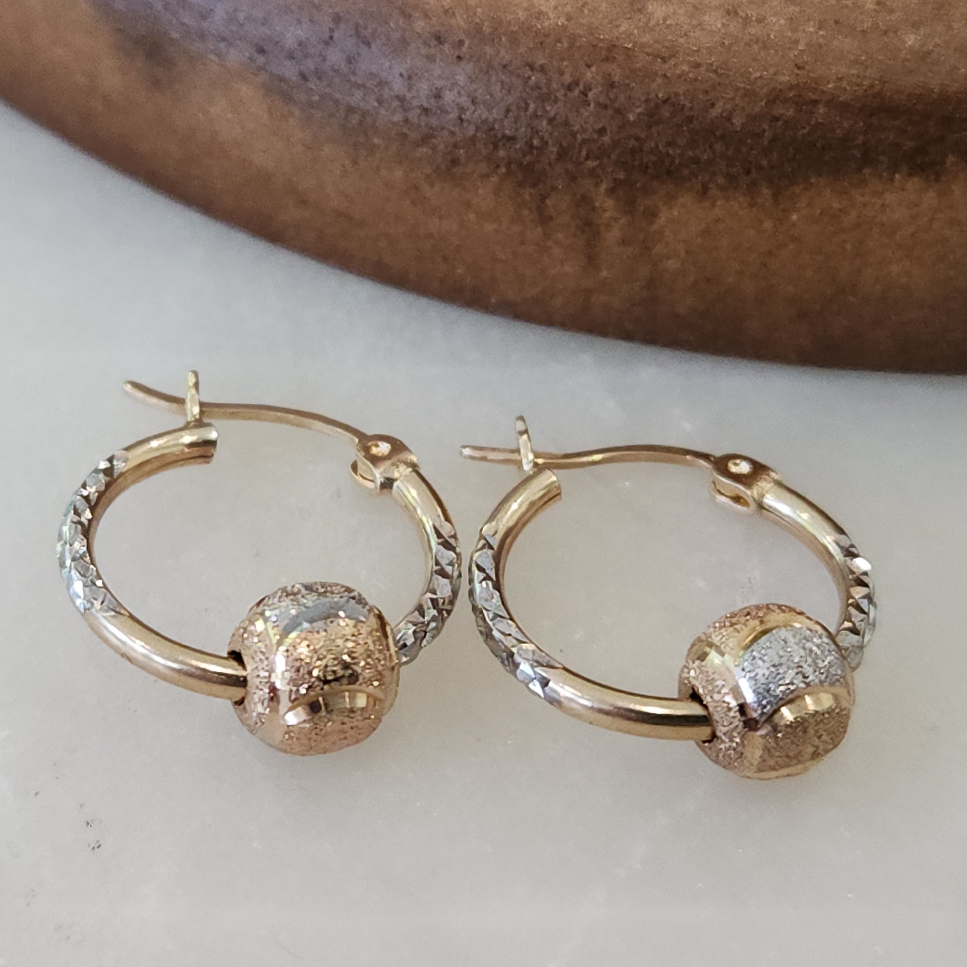 These yellow gold hoop earrings employ a textural technique called "diamond cut", where patterned grooves catch the light and create sparkle without the use of any gemstones. In this example, the technique is further enhanced with the application of white gold, and the addition of free-moving ball that bounces as you move.
