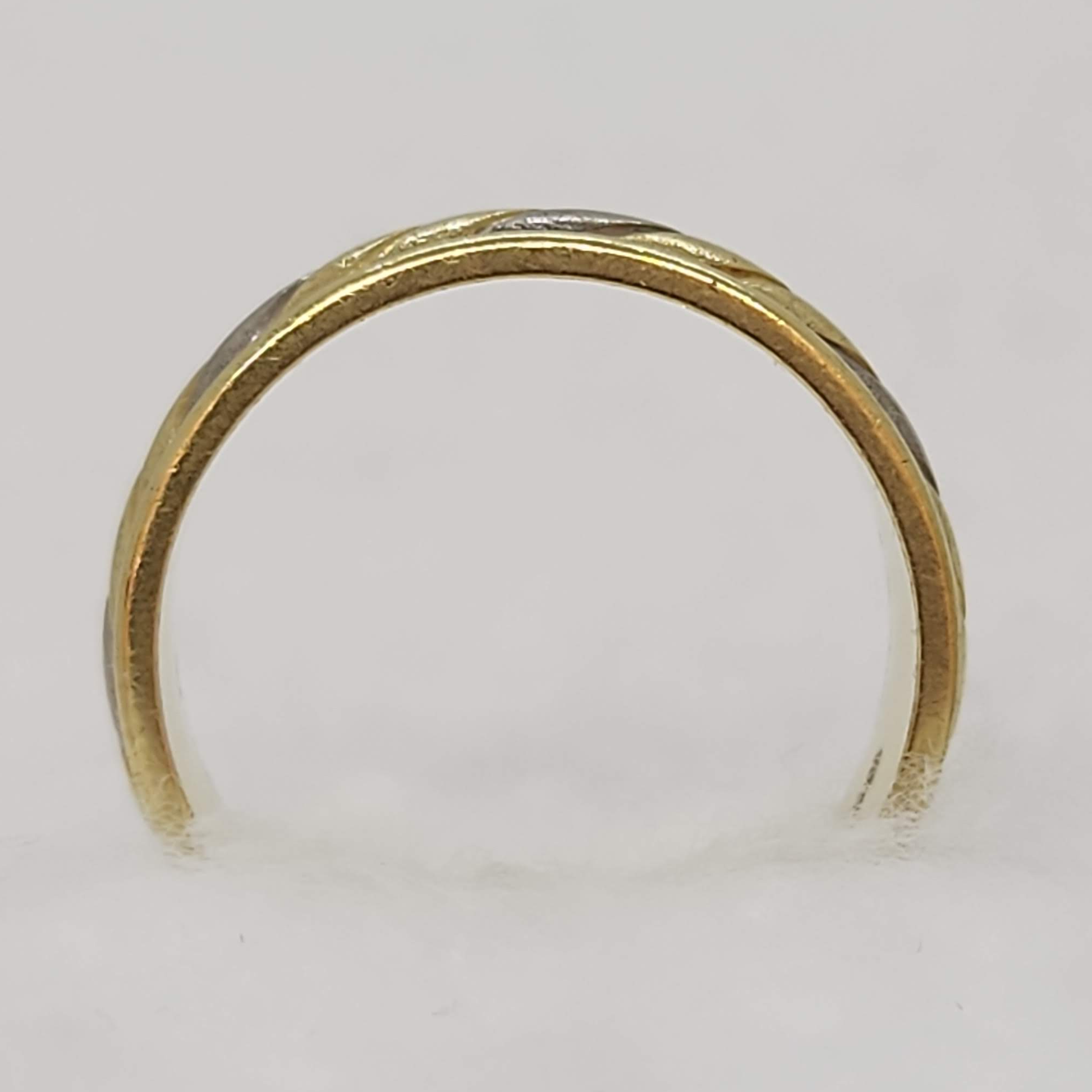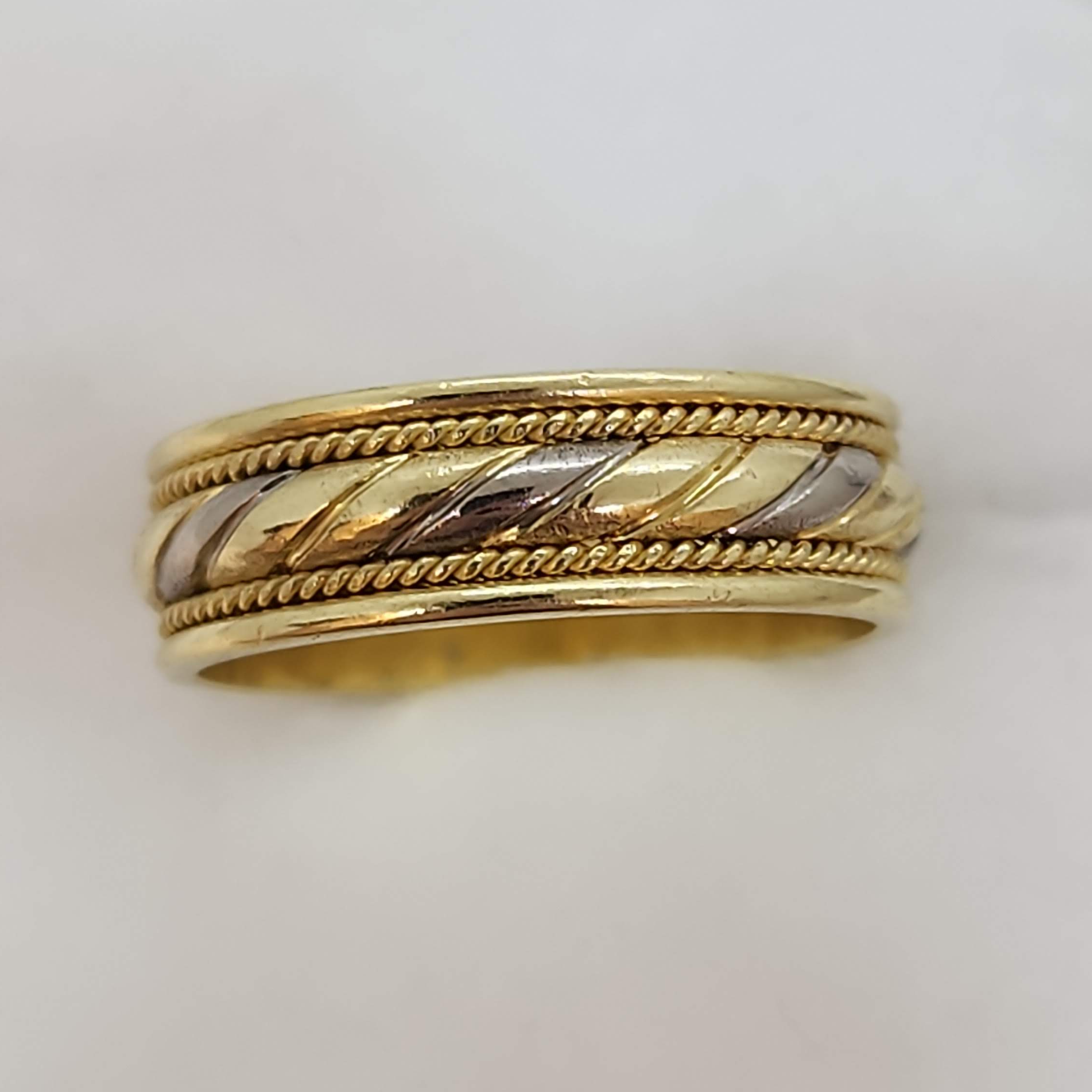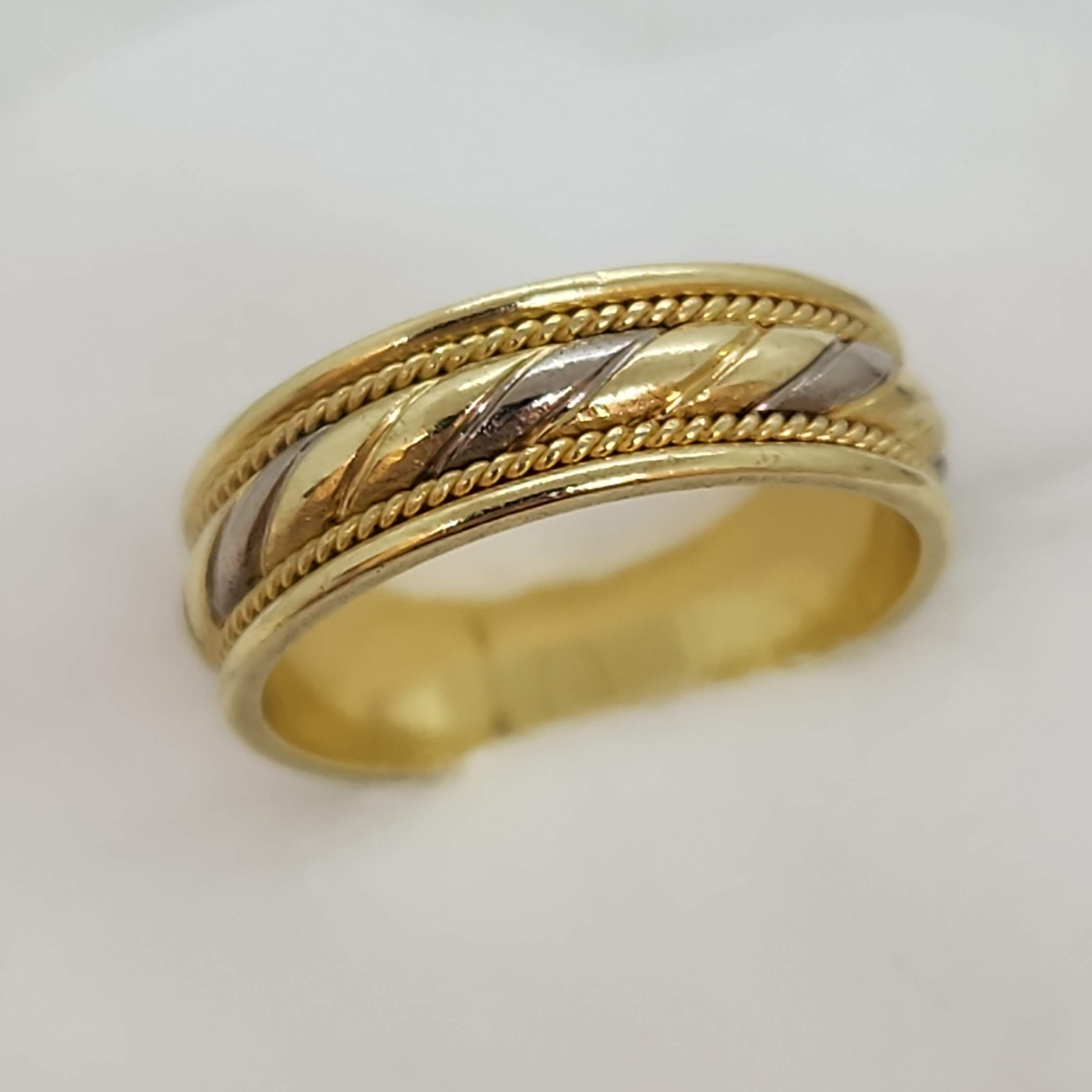 Intertwining strands of a twist in wedding rings represent two lives walking through life hand in hand. Rich hues in this 18k gold make for a beautiful contrast between the yellow and white tones.
