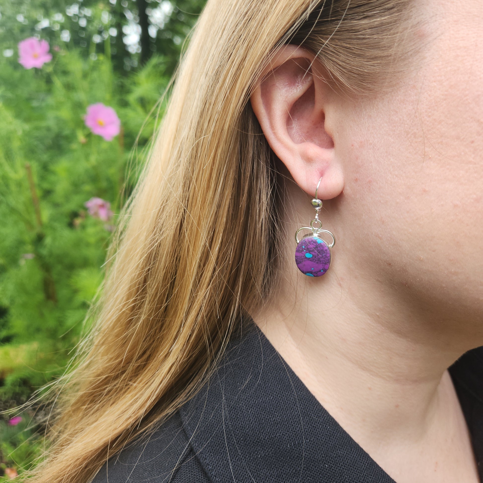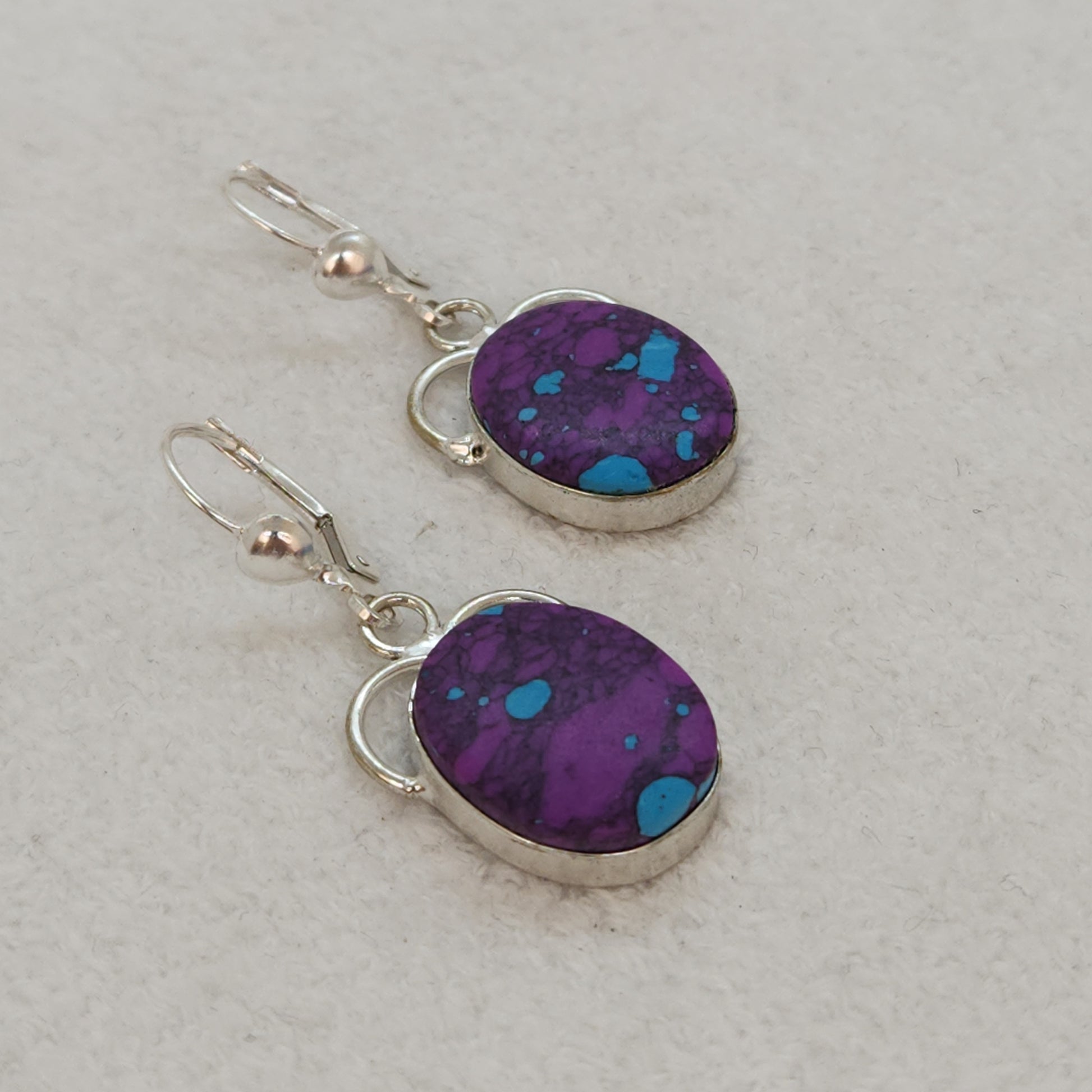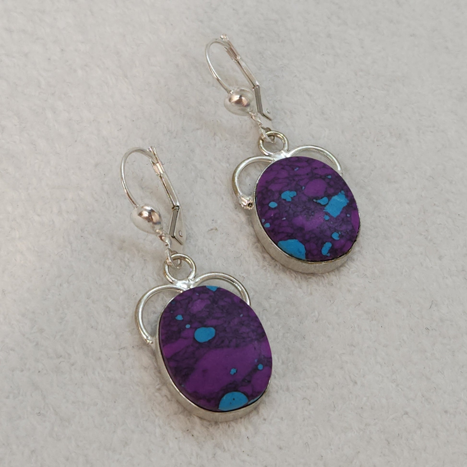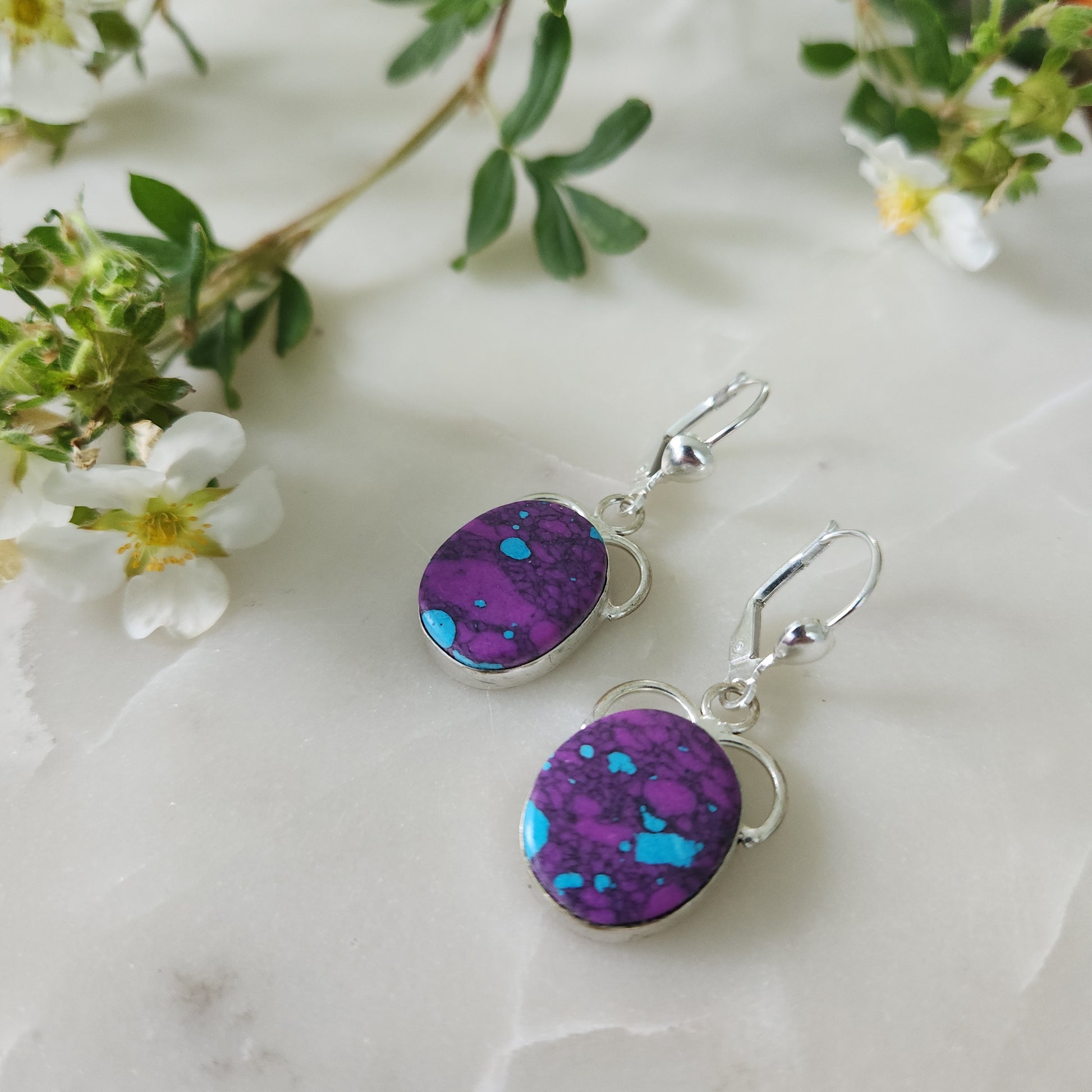 How fun! These earrings feature turquoise stones that have been chemically treated to induce deep purple hues, maintaining some flecks of the original blue stone. Turquoise is one of the stones associated with a December birthday, and these gorgeous danglers are a great way to show off your Sagittarian or Capricornian nature.