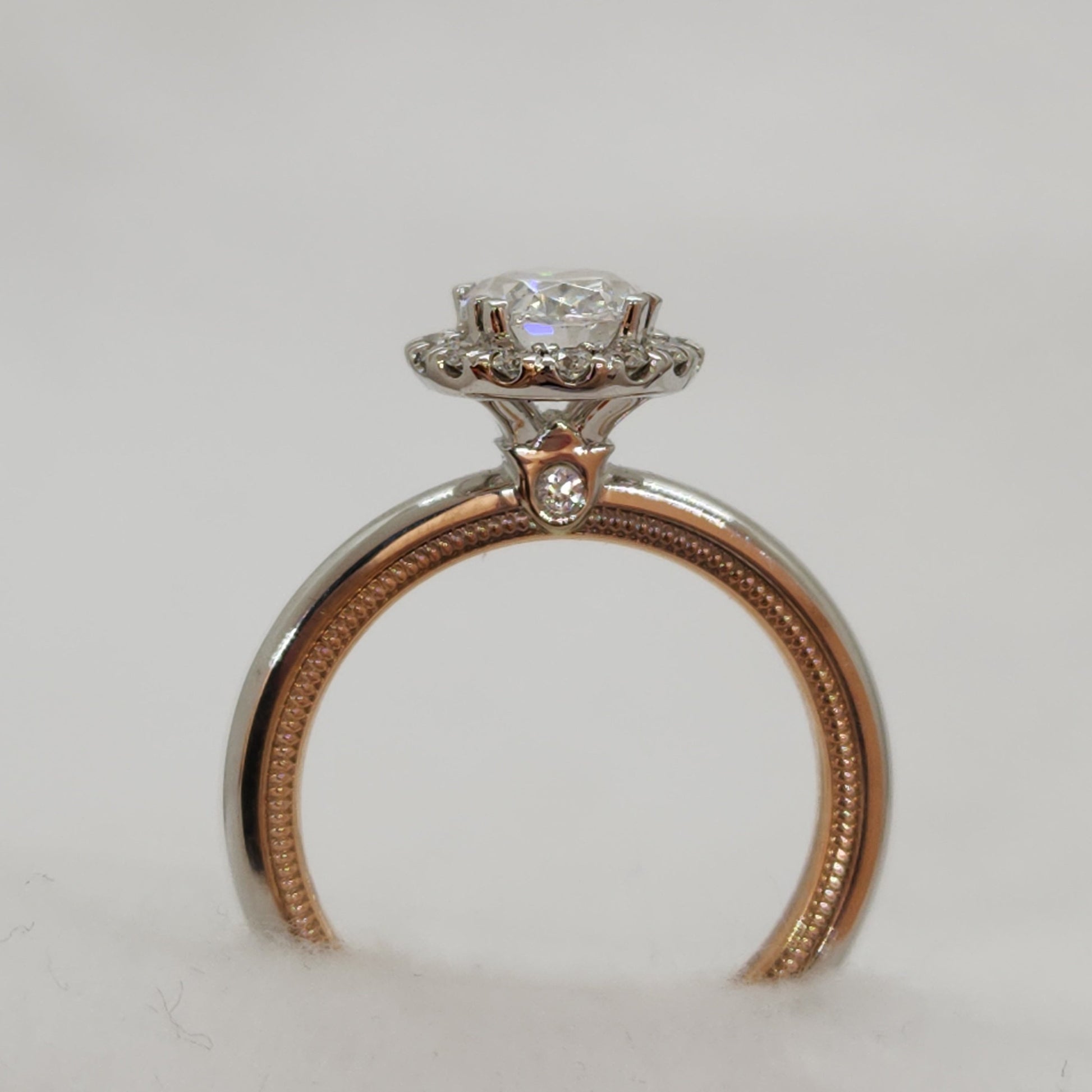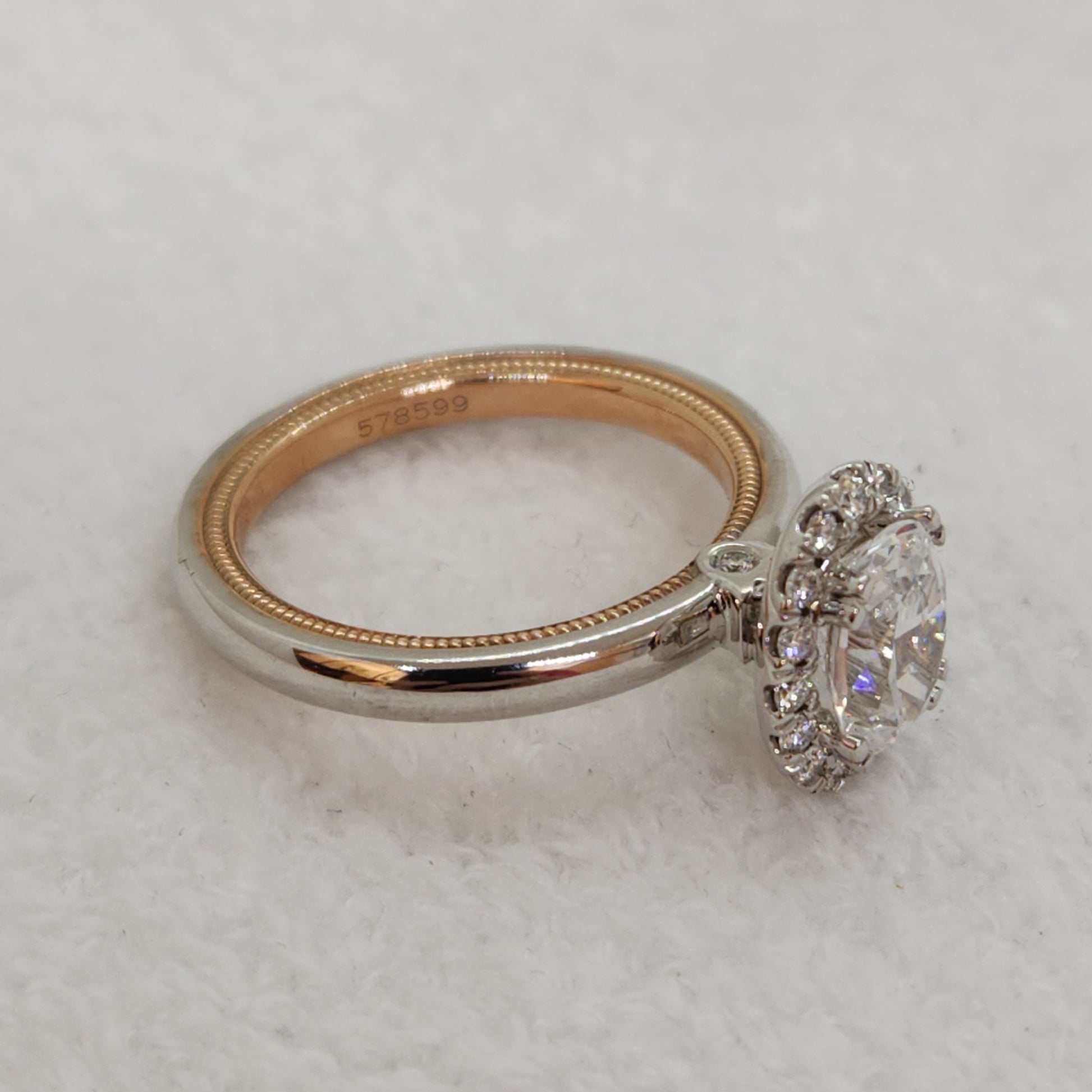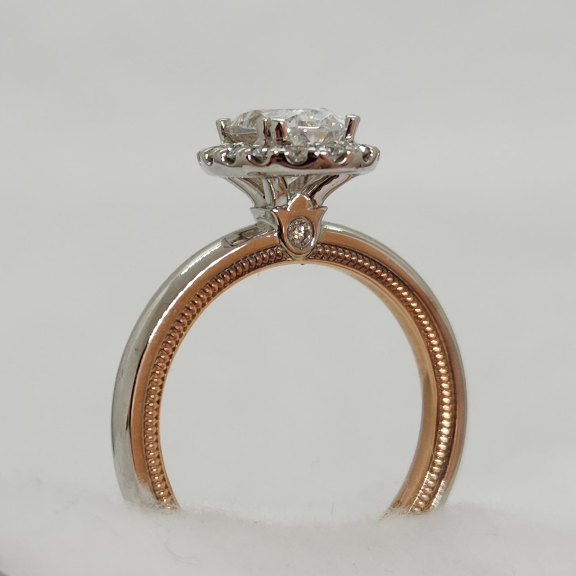 Ravishingly elegant, this oval halo setting is made oh-so unique by Verragio's attention to detail. You can see the rose gold peeking out from the inner band, highlighted by the millgrain details engraved on the sides. Currently the center stone is a cubic zirconia placeholder. A perfect opportunity to select your own perfect stone - a diamond, sapphire or something else that is just right for you.