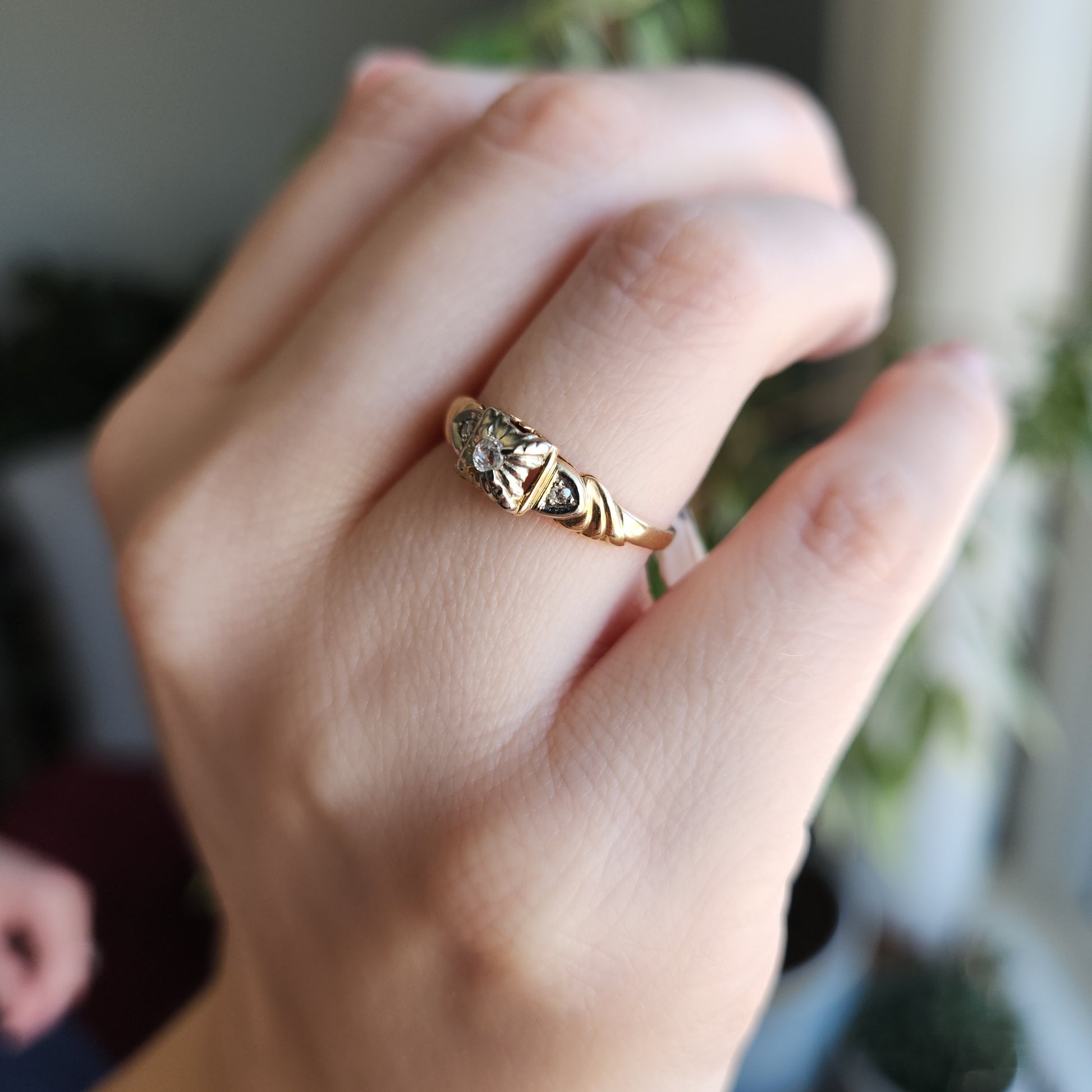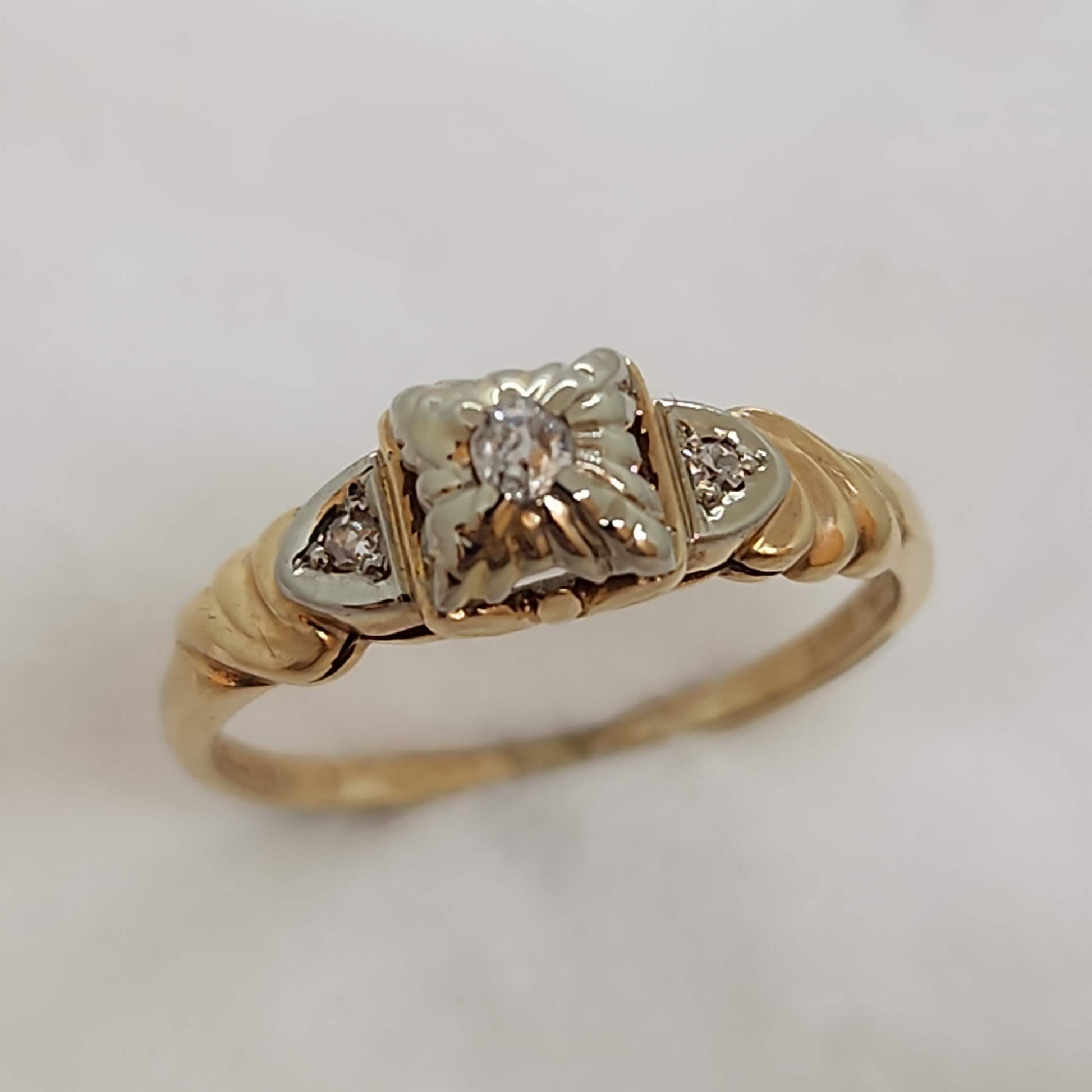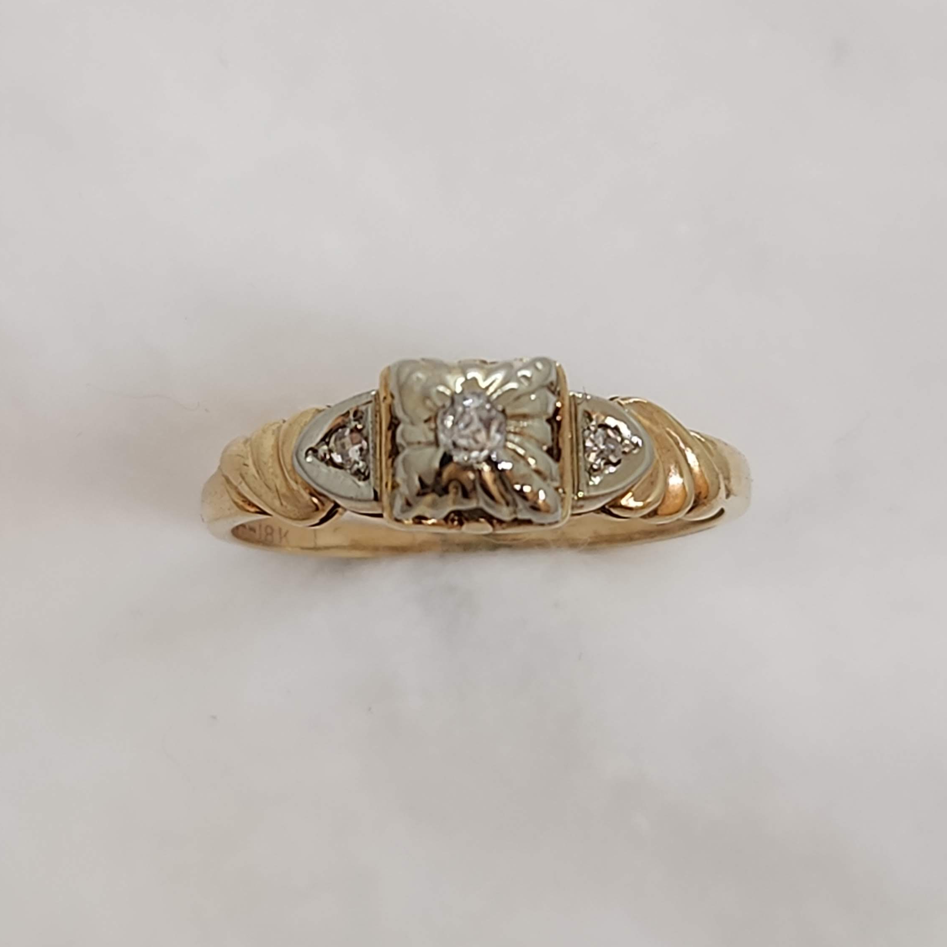 A Retro engagement ring! Rings from the 1940s-1950s are known for their two tone coloring, romantic styling, illusion diamond setting with small shoulder diamonds. This is a smaller dainty ring and will suit a small hand.