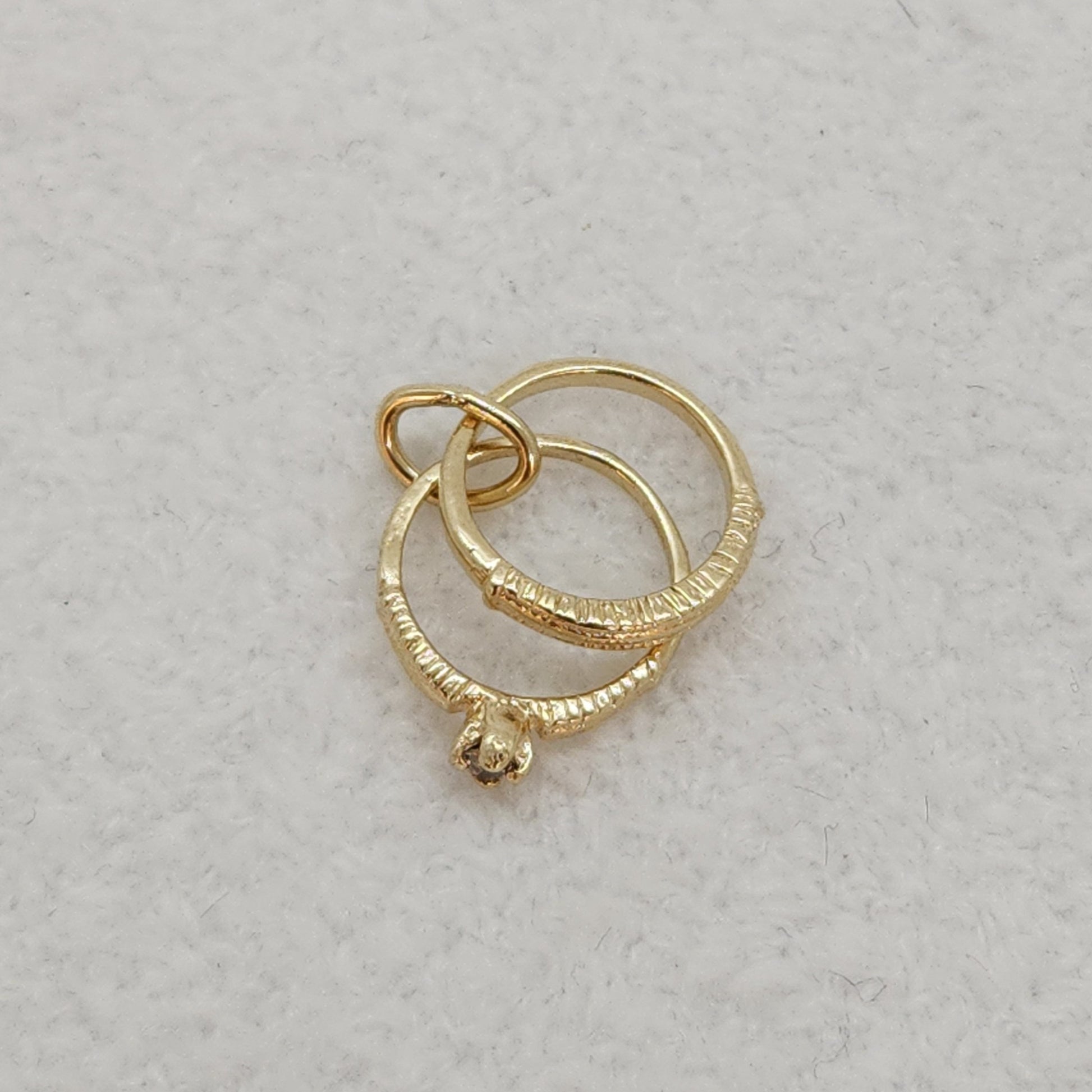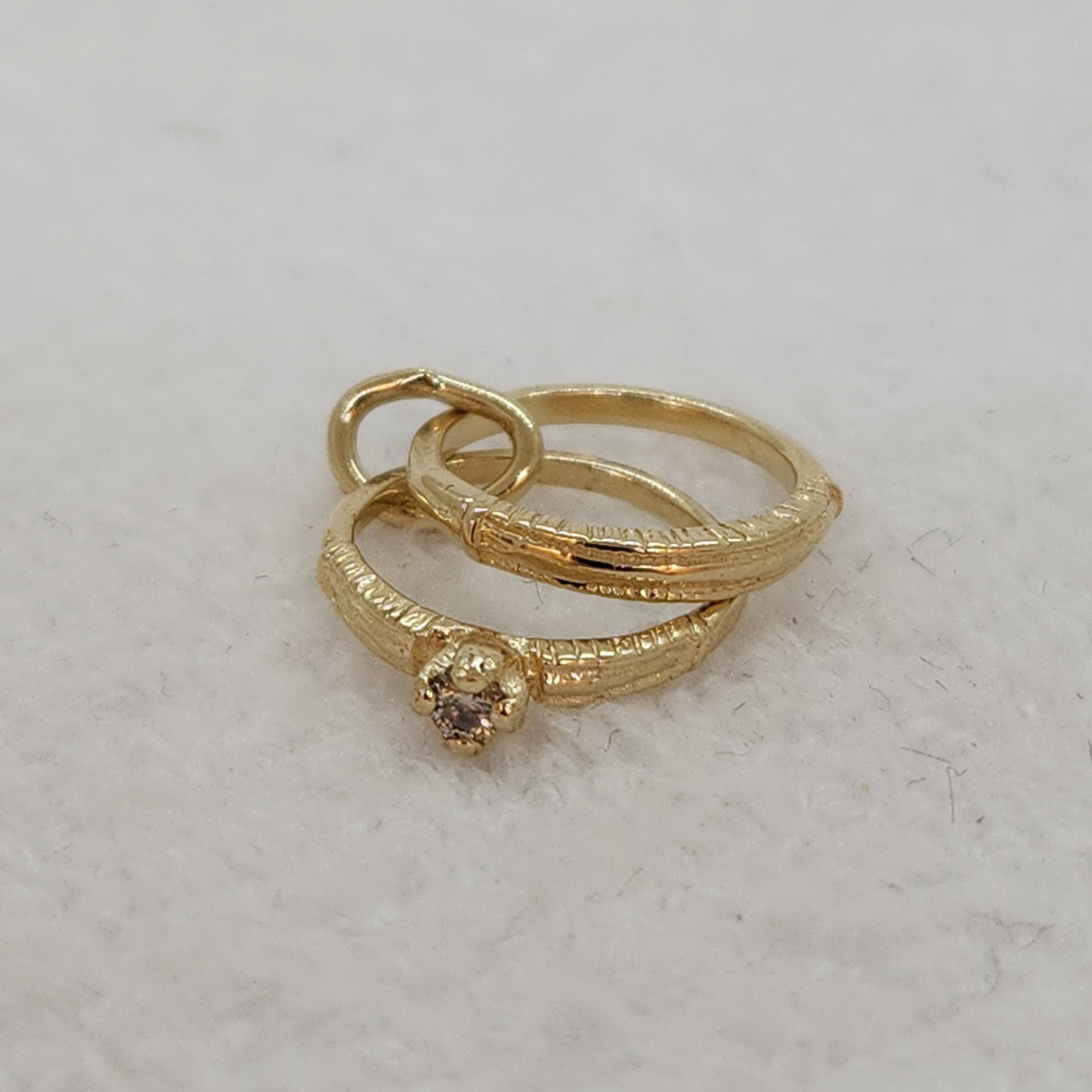 Perfect for when you'd prefer to wear your rings as a necklace! This engagement and wedding band set is beautifully detailed with matching texture and of course, a tiny diamond. They can be kept safe on a chain, close to your heart.