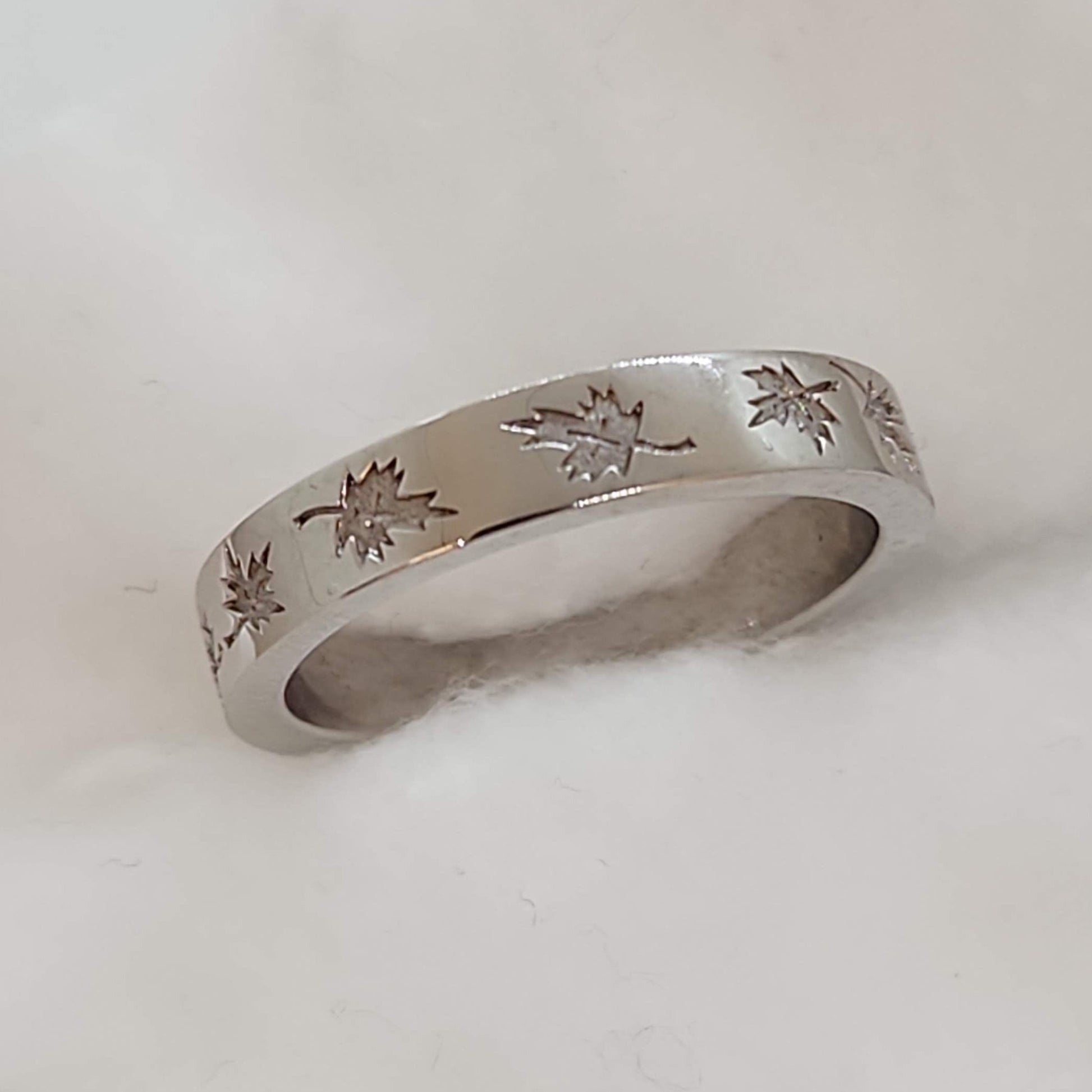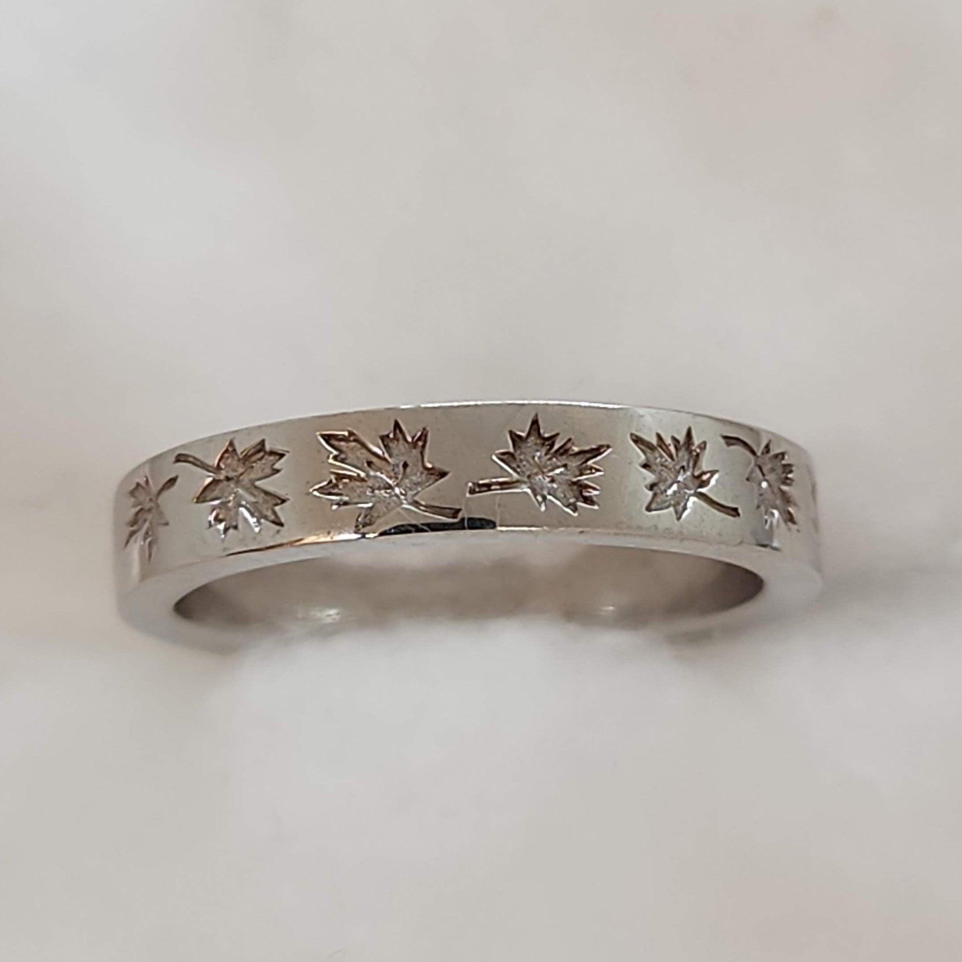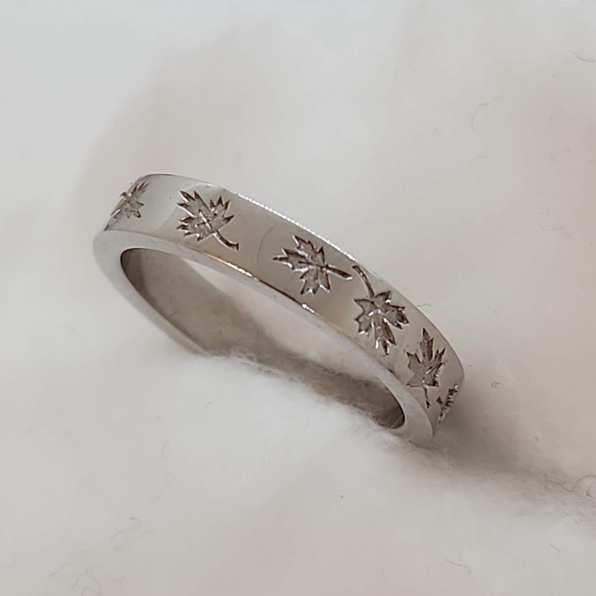Designed and handcrafted by Marigold Design Studio, this is part of our Canadiana Collection. The engraved maple leaves are each positioned a little differently all around this band, similar to how leaves fall to the ground and look beautiful just as they lay.