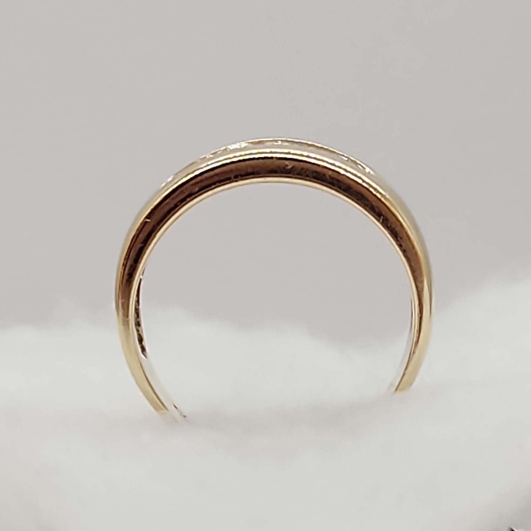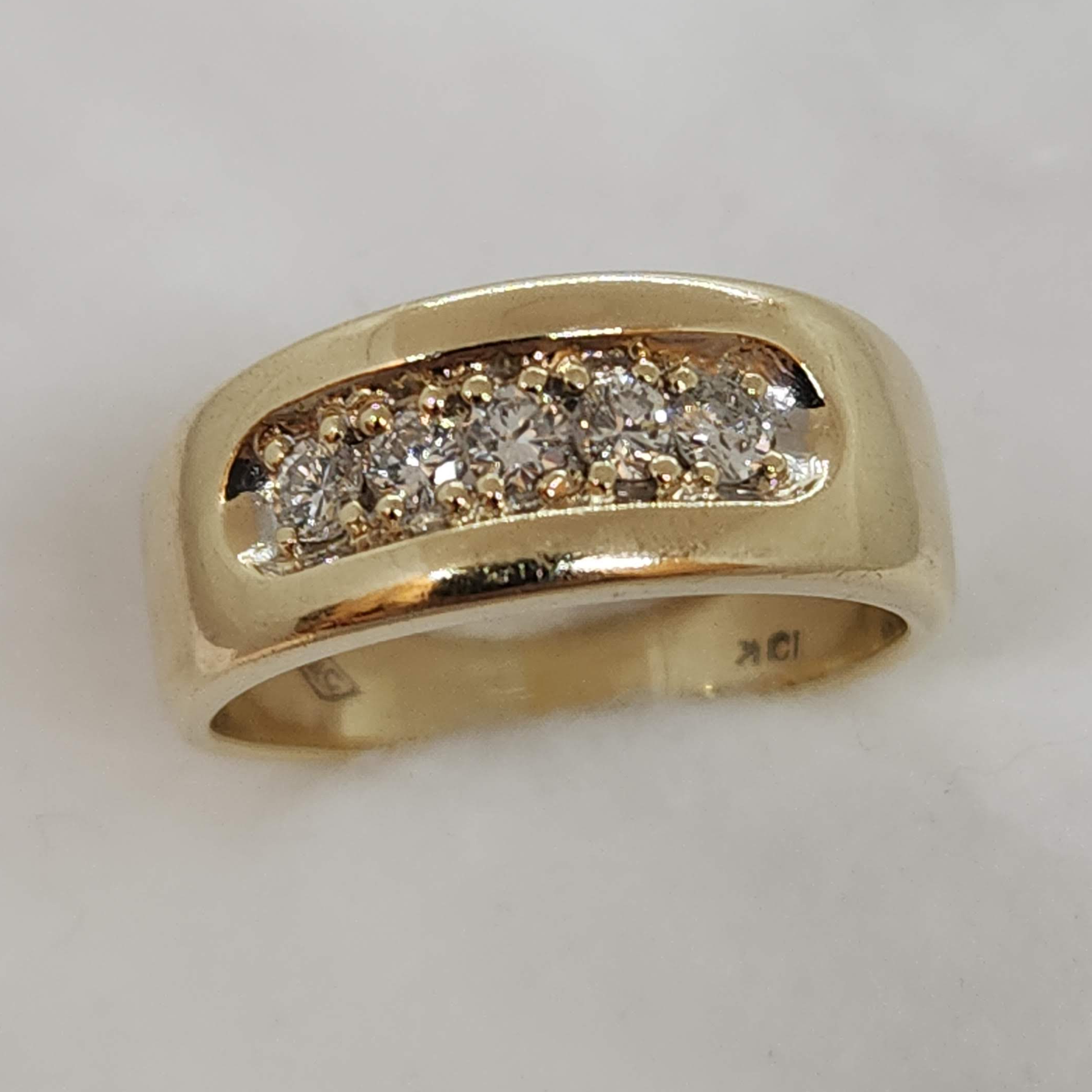 Unisex vintage ring featuring five diamonds. From the 80's, can be worn as a marriage band, stacked with other favorites, or on it's own as a decorative and comfortable diamond band.