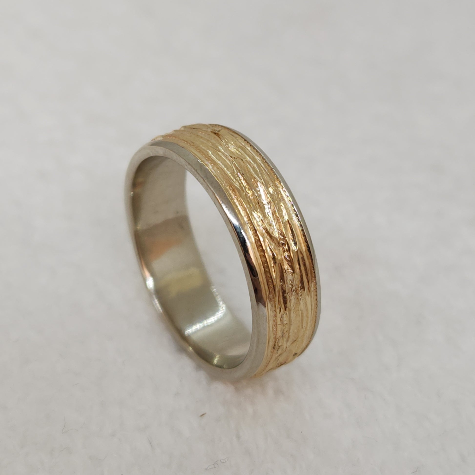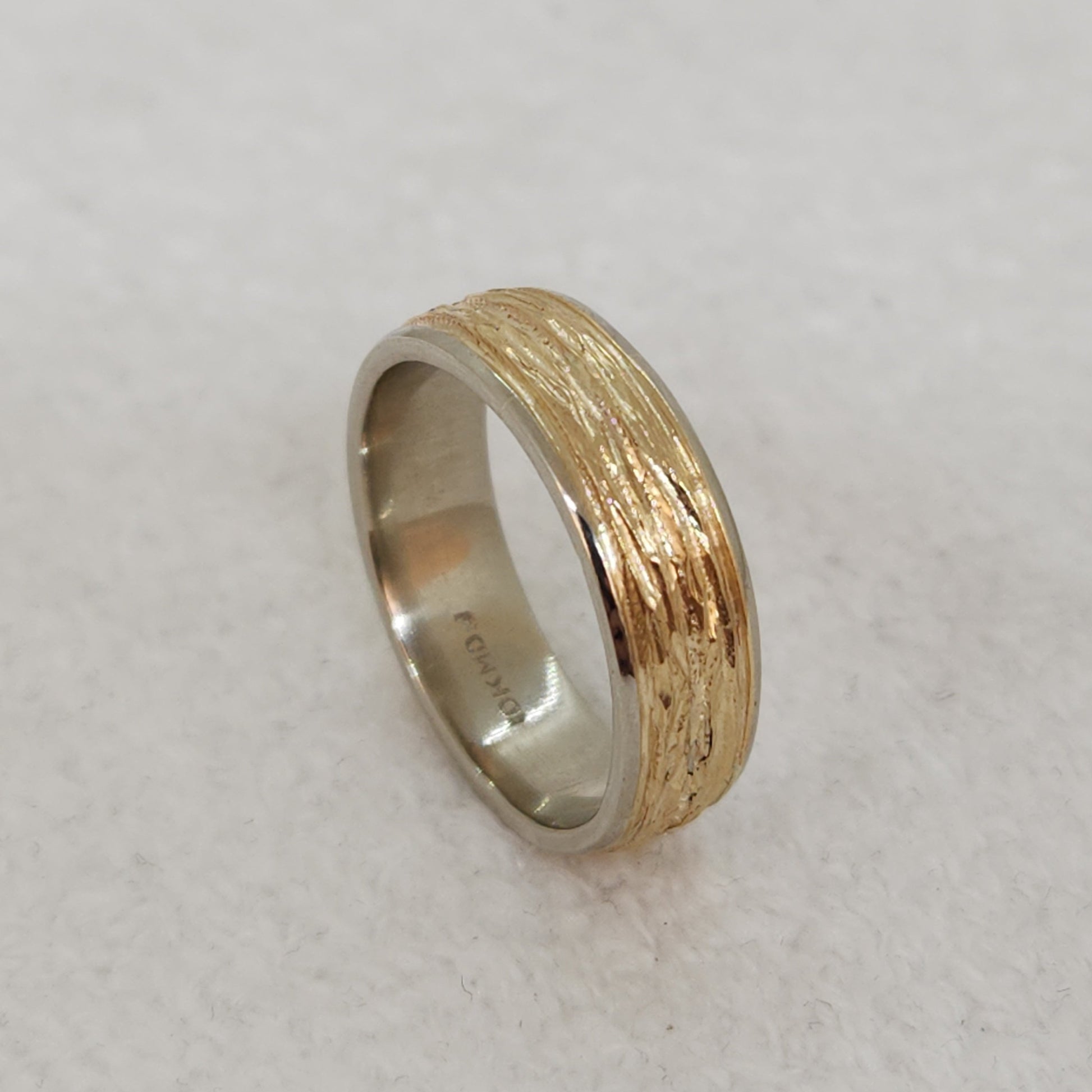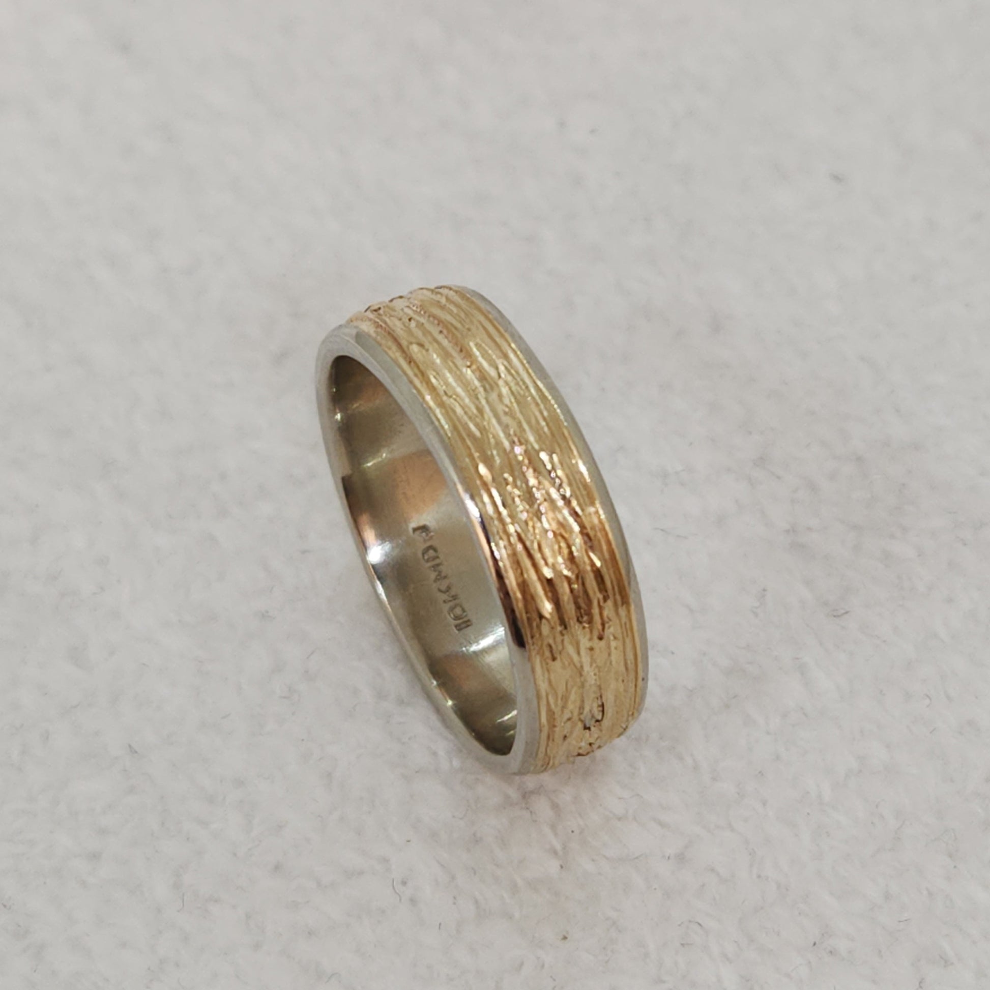 A natural softened weathered branch-like texture paired with a glowing polished white gold rim and inner surface. A great ring for daily wear, would also be perfect as a wedding band.