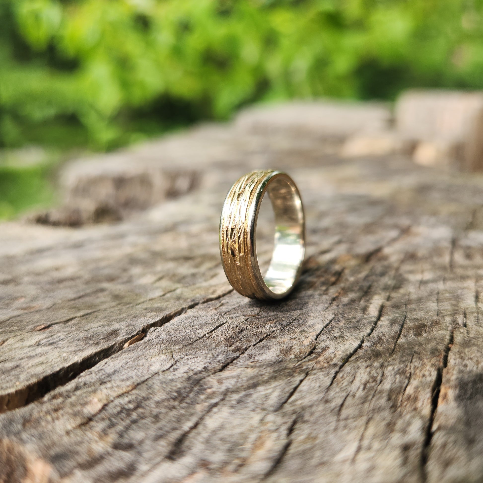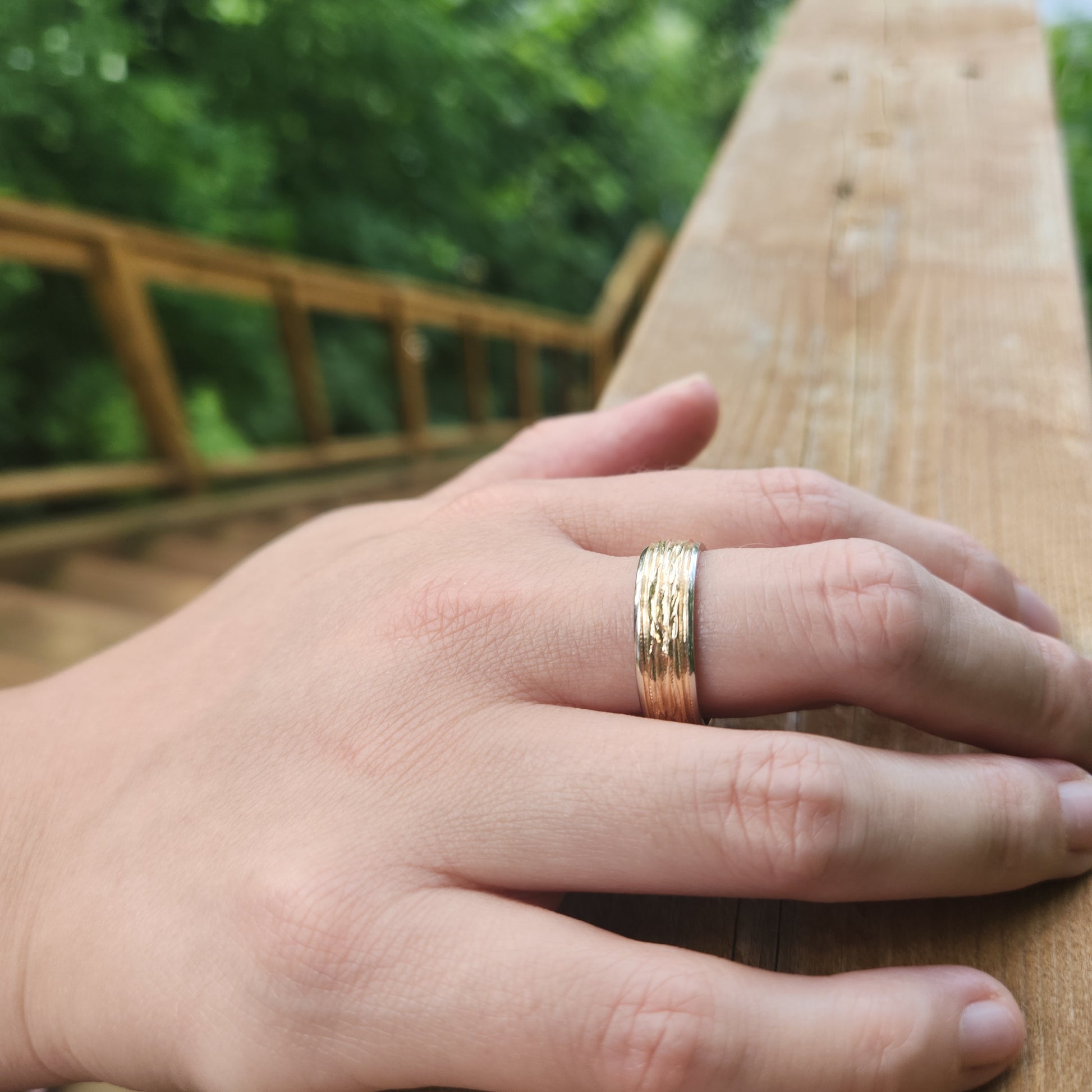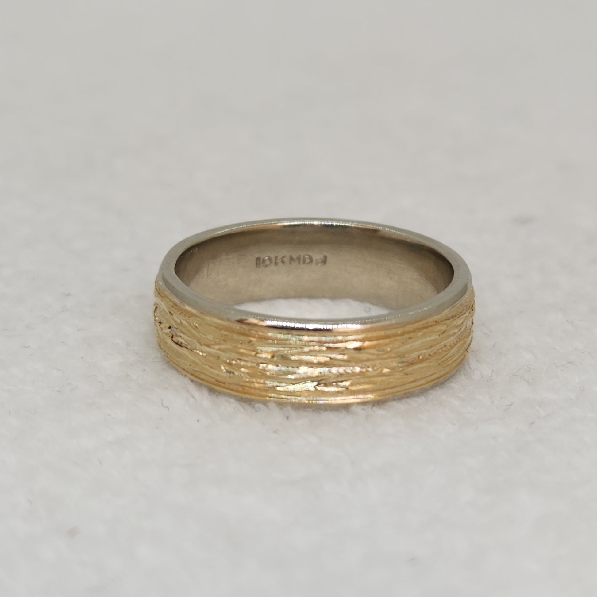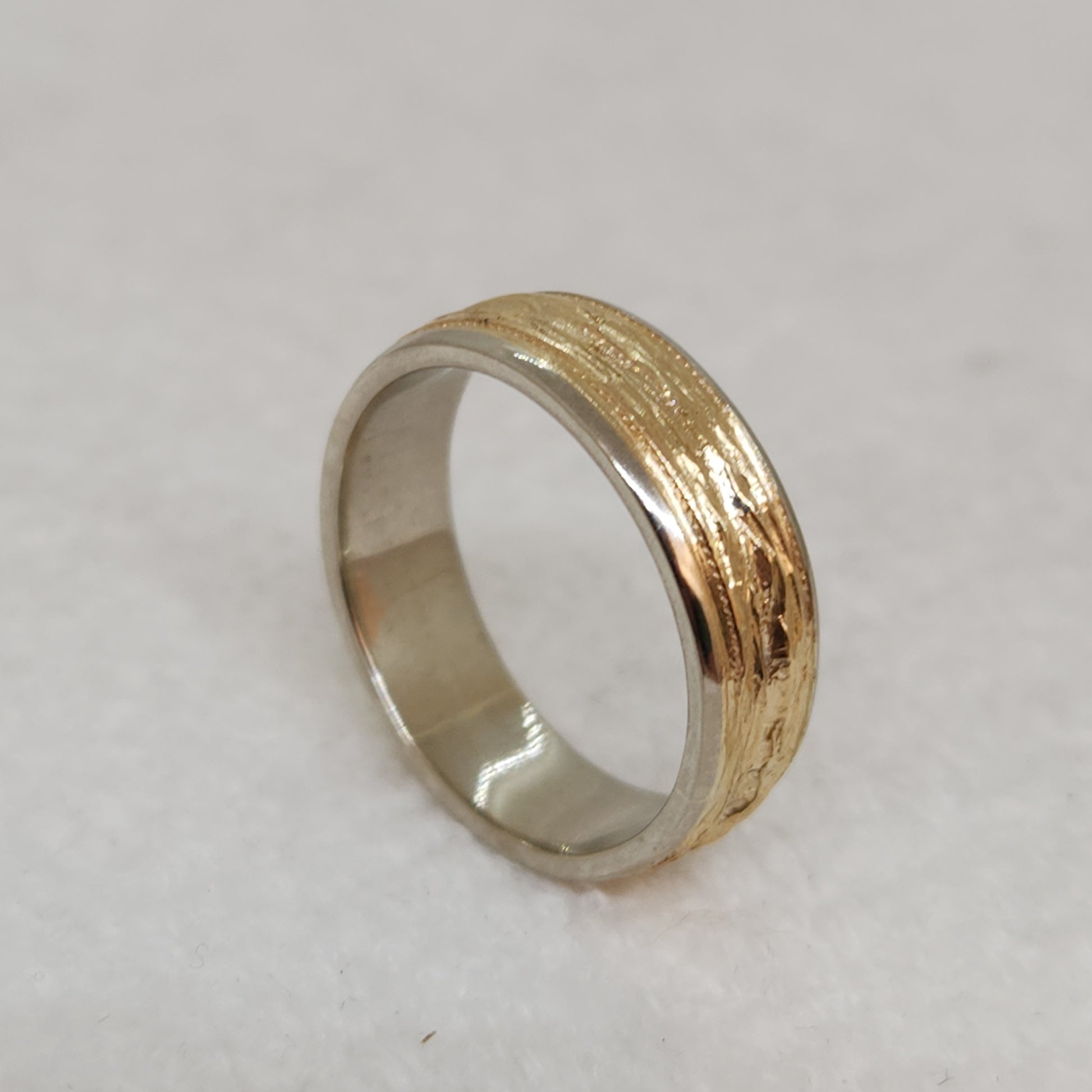 A natural softened weathered branch-like texture paired with a glowing polished white gold rim and inner surface. A great ring for daily wear, would also be perfect as a wedding band.