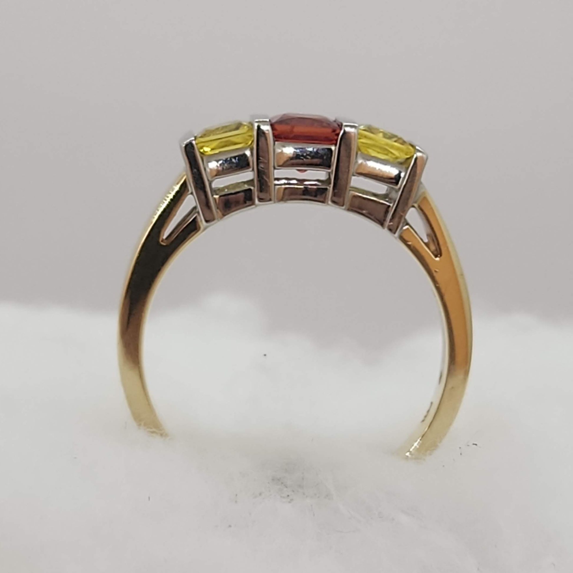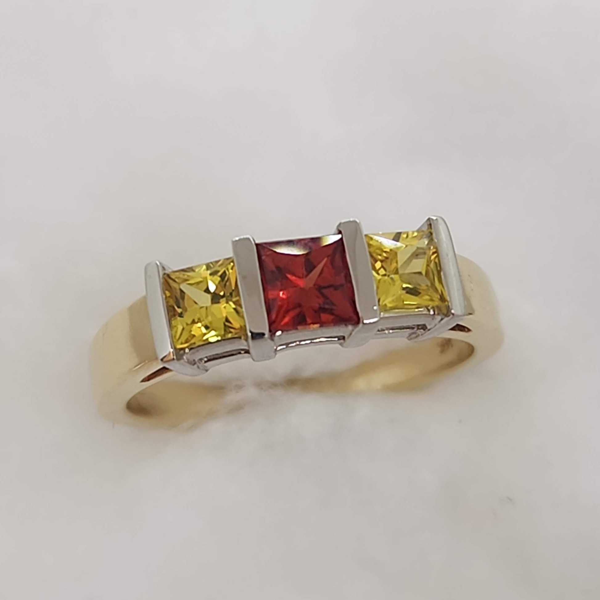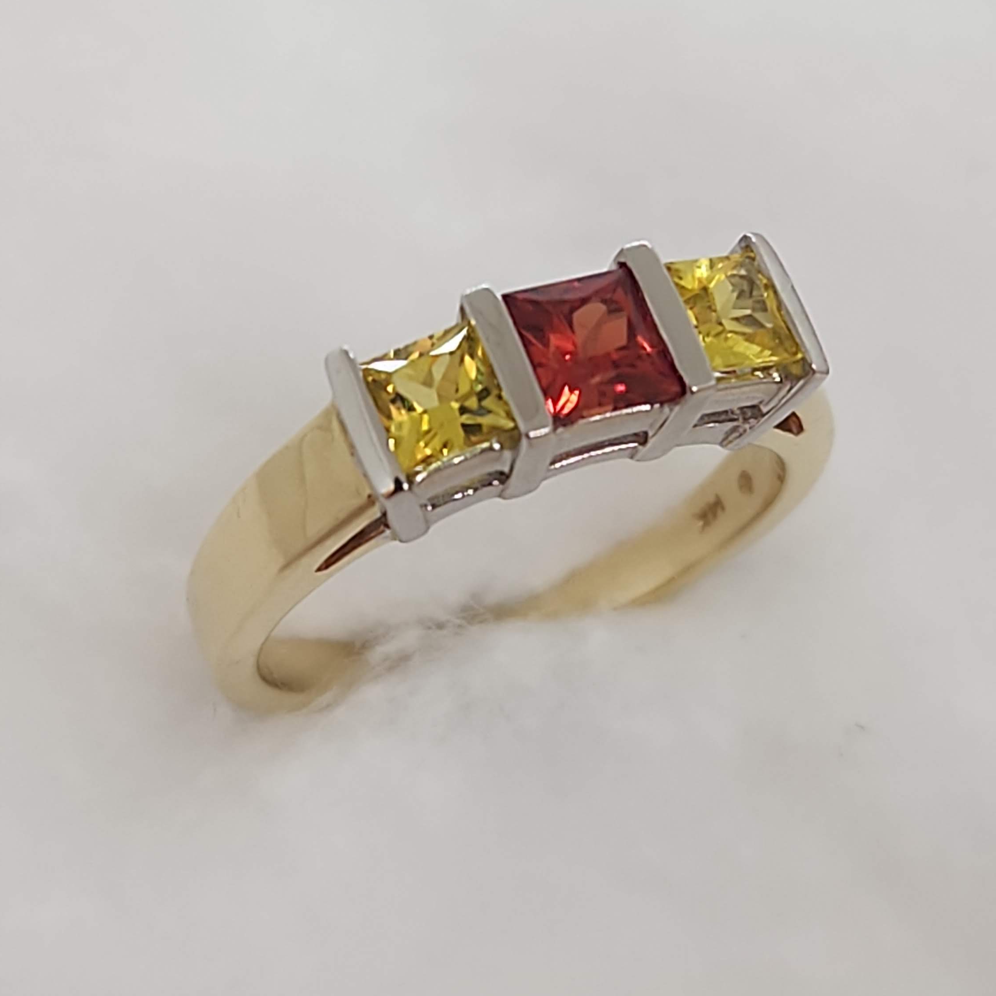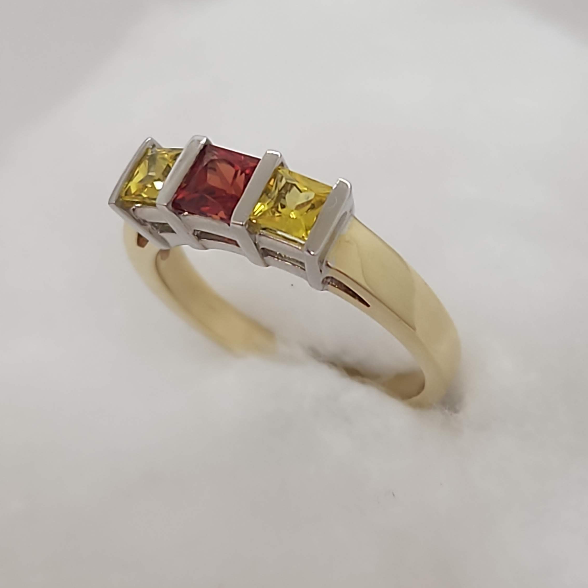 Who thought sapphires were just blue? This sunny three across features an intense orange sapphire flanked with two intense yellow sapphires. A simple modern design with an extremely unique stone pairing.